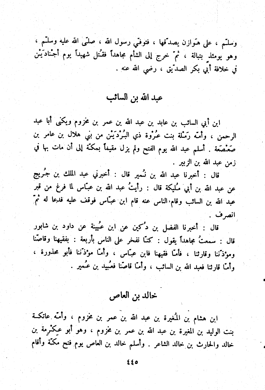 §خَالِدُ بْنُ الْعَاصِ بْنِ هِشَامِ بْنِ الْمُغِيرَةِ بْنِ عَبْدِ اللَّهِ بْنِ عُمَرَ بْنِ مَخْزُومٍ وَأُمُّهُ عَاتِكَةُ بِنْتُ الْوَلِيدِ بْنِ الْمُغِيرَةِ بْنِ عَبْدِ اللَّهِ بْنِ عُمَرَ بْنِ مَخْزُومٍ وَهُوَ أَبُو عِكْرِمَةَ بْنِ خَالِدٍ , وَالْحَارِثُ بْنُ خَالِدٍ الشَّاعِرُ، وَأَسْلَمَ خَالِدُ بْنُ الْعَاصِ يَوْمَ فَتْحِ مَكَّةَ وَأَقَامَ -[446]- بِهَا وَلَهُ عَقِبٌ وَقَدْ وَلِيَ خَالِدُ بْنُ الْعَاصِ مَكَّةَ
