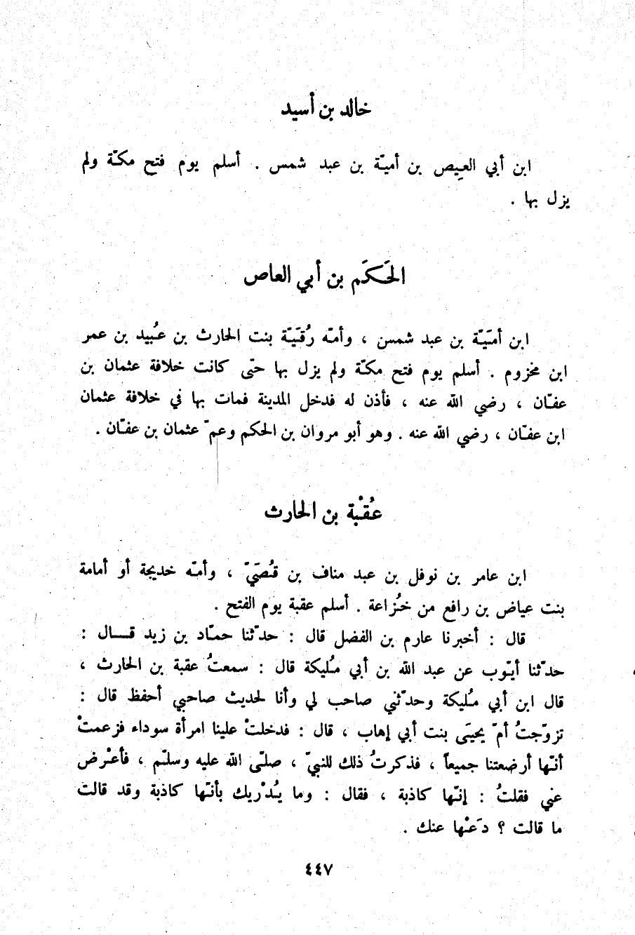 §الْحَكَمُ بْنُ أَبِي الْعَاصِ بْنِ أُمَيَّةَ بْنِ عَبْدِ شَمْسٍ وَأُمُّهُ رُقَيَّةُ بِنْتُ الْحَارِثِ بْنِ عُبَيْدِ بْنِ عُمَرَ بْنِ مَخْزُومٍ أَسْلَمَ يَوْمَ فَتْحِ مَكَّةَ وَلَمْ يَزَلْ بِهَا حَتَّى كَانَتْ خِلَافَةُ عُثْمَانَ بْنِ عَفَّانَ رَضِيَ اللَّهُ عَنْهُ فَأَذِنَ لَهُ فَدَخَلَ الْمَدِينَةَ فَمَاتَ بِهَا فِي خِلَافَةِ عُثْمَانَ بْنِ عَفَّانَ رَضِيَ اللَّهُ عَنْهُ وَهُوَ أَبُو مَرْوَانَ بْنِ الْحَكَمِ وَعَمُّ عُثْمَانَ بْنِ عَفَّانَ