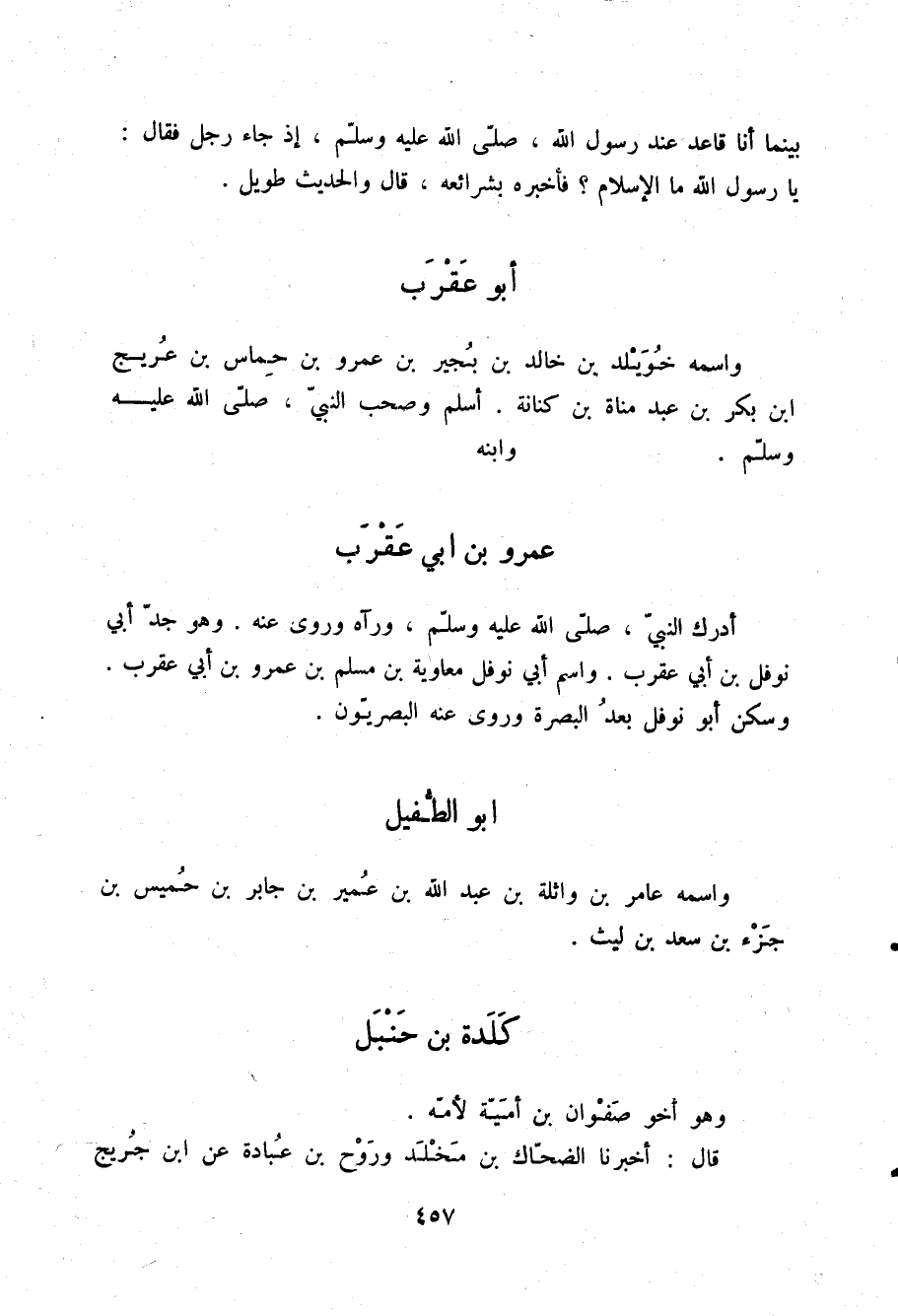 §أَبُو عَقْرَبٍ وَاسْمُهُ خُوَيْلِدُ بْنُ خَالِدِ بْنِ بُجَيْرِ بْنِ عَمْرِو بْنِ حِمَاسِ بْنِ عُرَيْجِ بْنِ بَكْرِ بْنِ عَبْدِ مَنَاةَ بْنِ كِنَانَةَ أَسْلَمَ وَصَحِبَ النَّبِيَّ صلّى الله عليه وسلم وَابْنُهُ عَمْرُو بْنُ أَبِي عَقْرَبٍ أَدْرَكَ النَّبِيَّ صلّى الله عليه وسلم وَرَآهُ وَرَوَى عَنْهُ وَهُوَ جَدُّ أَبِي نَوْفَلِ بْنِ أَبِي عَقْرَبٍ وَاسْمُ أَبِي نَوْفَلٍ مُعَاوِيَةُ بْنُ مُسْلِمِ بْنِ عَمْرِو بْنِ أَبِي عَقْرَبٍ وَسَكَنَ أَبُو نَوْفَلٍ بَعْدُ الْبَصْرَةَ وَرَوَى عَنْهُ الْبَصْرِيُّونَ