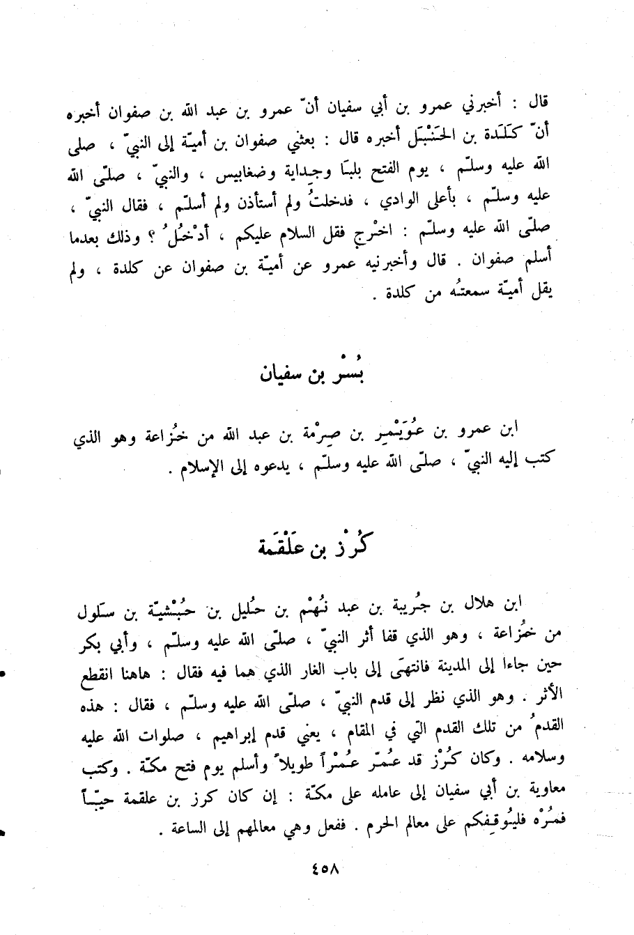 §كُرْزُ بْنُ عَلْقَمَةَ بْنِ هِلَالِ بْنِ جَرِيبَةَ بْنِ عَبْدِ نُهْمِ بْنِ حُلَيْلِ بْنِ حُبْشِيَّةَ ابْنِ سَلُولٍ مِنْ خُزَاعَةَ وَهُوَ الَّذِي قَفَّا أَثَرَ النَّبِيِّ صلّى الله عليه وسلم وَأَبِي بَكْرٍ حِينَ جَاءَا إِلَى الْمَدِينَةِ فَانْتَهَى إِلَى بَابِ الْغَارِ الَّذِي هُمَا فِيهِ فَقَالَ: هَاهُنَا انْقَطَعَ الْأَثَرُ وَهُوَ الَّذِي نَظَرَ إِلَى قَدَمِ النَّبِيِّ صلّى الله عليه وسلم فَقَالَ: هَذِهِ الْقَدَمُ مِنْ تِلْكِ الْقَدَمِ الَّتِي فِي الْمَقَامِ يَعْنِي قَدَمَ إِبْرَاهِيمَ صَلَوَاتُ اللَّهِ عَلَيْهِ وَسَلَامُهُ، وَكَانَ كُرْزٌ قَدْ عُمِّرَ عُمْرًا طَوِيلًا وَأَسْلَمَ يَوْمَ فَتْحِ مَكَّةَ وَكَتَبَ مُعَاوِيَةُ بْنُ أَبِي سُفْيَانَ إِلَى عَامِلِهِ عَلَى مَكَّةَ إِنْ كَانَ كُرْزُ بْنُ عَلْقَمَةَ حَيًّا فَمُرْهُ فَلْيُوقِفْكُمْ عَلَى مَعَالِمِ الْحَرَمِ فَفَعَلَ وَهِيَ مَعَالِمُهُمْ إِلَى السَّاعَةِ