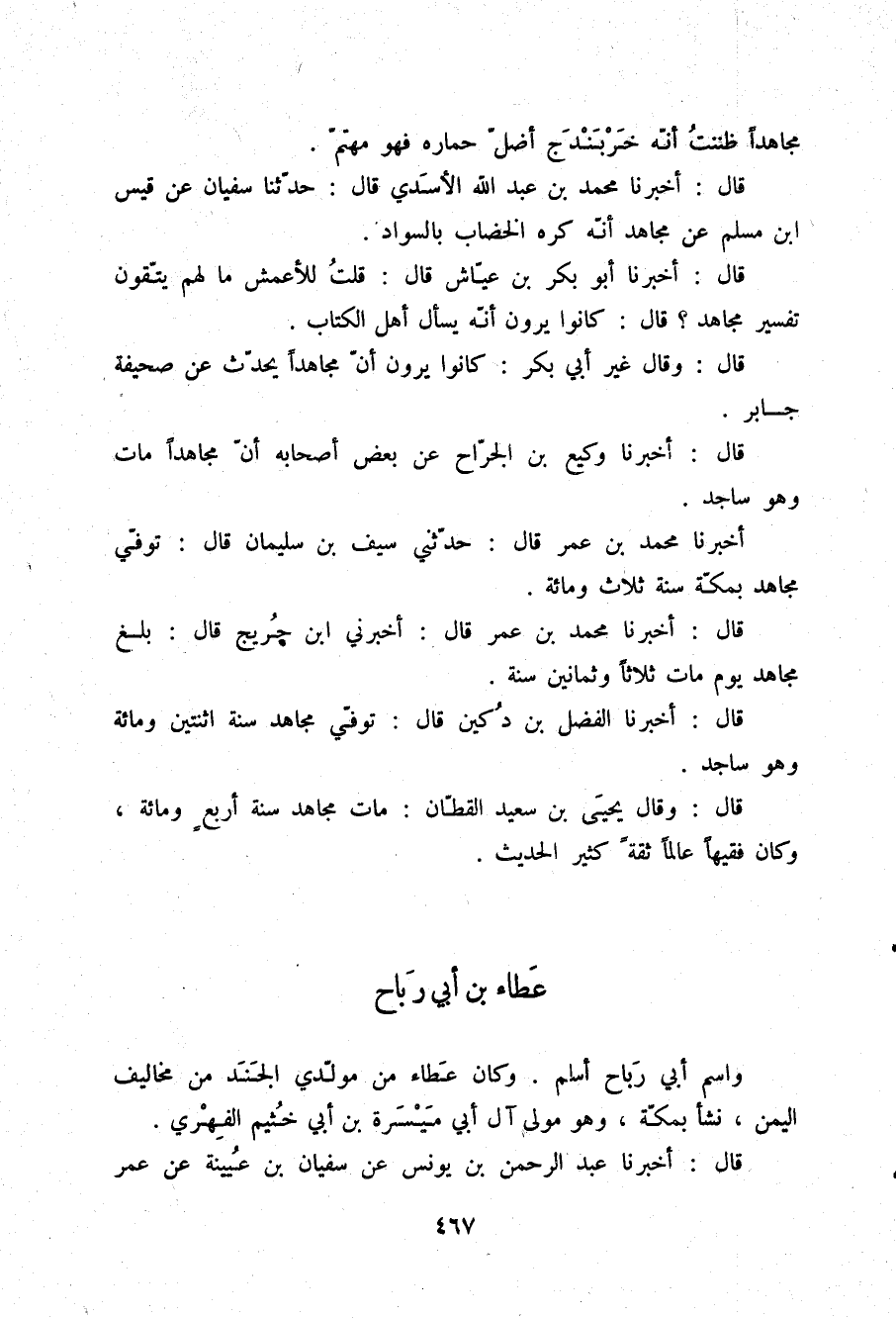 §عَطَاءُ بْنُ أَبِي رَبَاحٍ وَاسْمُ أَبِي رَبَاحٍ أَسْلَمُ وَكَانَ عَطَاءٌ مِنْ مُوَلَّدِي الْجَنَدِ مِنْ مَخَالِيفِ الْيَمَنِ نَشَأَ بِمَكَّةَ وَهُوَ مَوْلَى آلِ أَبِي مَيْسَرَةَ بْنِ أَبِي خُثَيْمٍ الْفِهْرِيِّ
