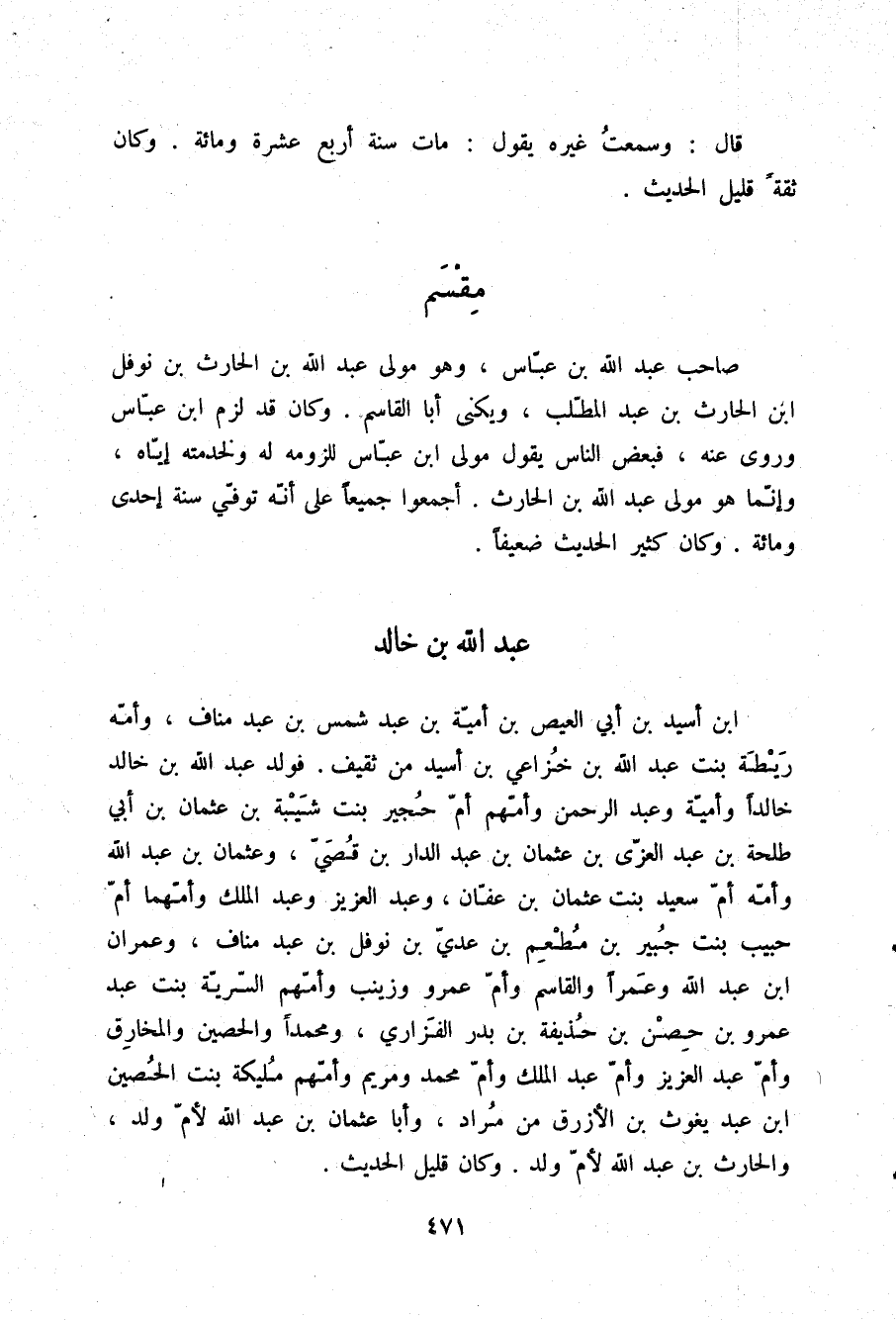 §عَبْدُ اللَّهِ بْنُ خَالِدِ بْنِ أَسِيدِ بْنِ أَبِي الْعِيصِ بْنِ أُمَيَّةَ بْنِ عَبْدِ شَمْسِ بْنِ عَبْدِ مَنَافٍ , وَأُمُّهُ رَيْطَةُ بِنْتُ عَبْدِ اللَّهِ بْنِ خُزَاعَى بْنِ أُسَيْدِ مِنْ ثَقِيفٍ فَوَلَدَ عَبْدُ اللَّهِ بْنُ خَالِدٍ خَالِدًا وَأُمَيَّةَ وَعَبْدَ الرَّحْمَنِ وَأُمُّهُمْ أُمُّ حُجَيْرٍ بِنْتُ شَيْبَةَ بْنِ عُثْمَانَ بْنِ أَبِي طَلْحَةَ بْنِ عَبْدِ الْعُزَّى بْنِ عُثْمَانَ بْنِ عَبْدِ الدَّارِ بْنِ قُصَيٍّ , وَعُثْمَانَ بْنَ عَبْدِ اللَّهِ , وَأُمُّهُ أُمُّ سَعِيدٍ بِنْتُ عُثْمَانَ بْنِ عَفَّانَ , وَعَبْدَ الْعَزِيزِ وَعَبْدَ الْمَلِكِ وَأُمُّهُمَا أُمُّ حَبِيبٍ بِنْتُ جُبَيْرِ بْنِ مُطْعِمِ بْنِ عَدِيِّ بْنِ نَوْفَلِ بْنِ عَبْدِ مَنَافِ , وَعِمْرَانَ بْنَ عَبْدِ اللَّهِ وَعَمْرًا وَالْقَاسِمَ , وَأُمَّ عَمْرٍو وَزَيْنَبَ , وَأُمُّهُمُ السَّرِيَّةُ بِنْتُ عَبْدِ عَمْرِو بْنِ حِصْنِ بْنِ حُذَيْفَةَ بْنِ بَدْرٍ الْفَزَارِيُّ , وَمُحَمَّدًا وَالْحُصَيْنَ وَالْمُخَارِقَ وَأُمَّ عَبْدِ الْعَزِيزِ وَأُمَّ عَبْدِ الْمَلِكِ وَأُمَّ مُحَمَّدٍ وَمَرْيَمَ , وَأُمُّهُمْ مُلَيْكَةُ بِنْتُ الْحُصَيْنِ بْنِ عَبْدِ يَغُوثَ بْنِ الْأَزْرَقِ مِنْ مُرَادٍ , وَأَبَا عُثْمَانَ بْنَ عَبْدِ اللَّهِ لِأُمِّ وَلَدٍ , وَالْحَارِثَ بْنَ عَبْدِ اللَّهِ لِأُمِّ وَلَدٍ , وَكَانَ قَلِيلَ الْحَدِيثِ