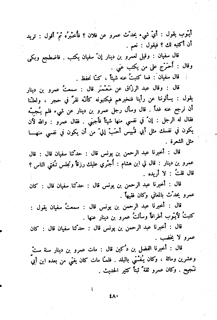 قَالَ: أَخْبَرَنَا عَبْدُ الرَّحْمَنِ بْنُ يُونُسَ، قَالَ: حَدَّثَنَا سُفْيَانُ، قَالَ: «§كَانَ عَمْرٌو يُحَدِّثُ بِالْمَعَانِي وَكَانَ فَقِيهًا»