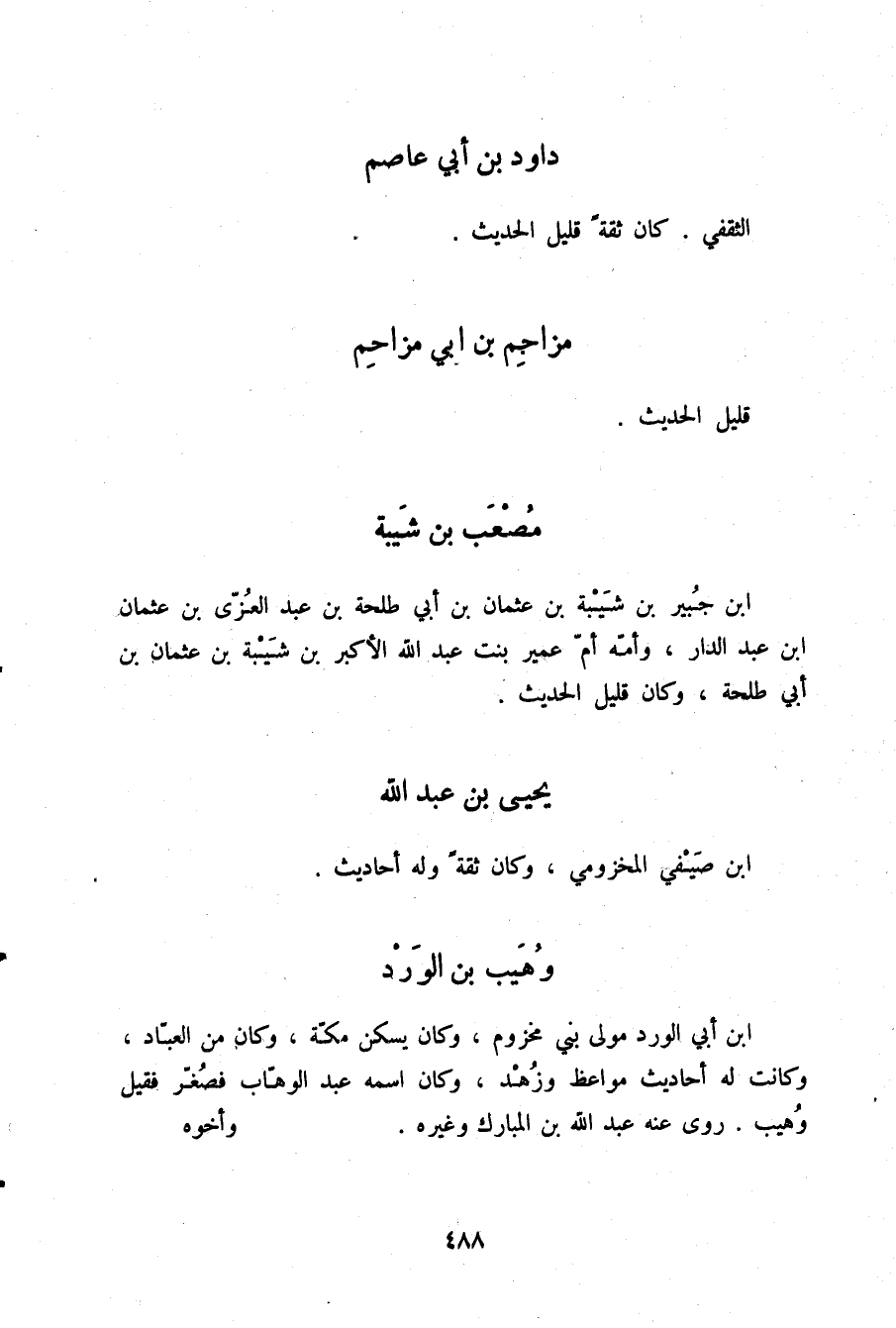 §وُهَيْبُ بْنُ الْوَرْدِ بْنِ أَبِي الْوَرْدِ مَوْلَى بَنِي مَخْزُومٍ، وَكَانَ يَسْكُنُ مَكَّةَ وَكَانَ مِنَ الْعُبَّادِ، وَكَانَتْ لَهُ أَحَادِيثُ مَوَاعِظَ وَزُهْدٍ وَكَانَ اسْمُهُ عَبْدَ الْوَهَّابِ فَصُغِّرَ فَقِيلَ وُهَيْبٌ، رَوَى عَنْهُ عَبْدُ اللَّهِ بْنُ الْمُبَارَكِ وَغَيْرُهُ وَأَخُوهُ -[489]- عَبْدُ الْجَبَّارِ بْنُ الْوَرْدِ رَوَى عَنِ ابْنِ أَبِي مُلَيْكَةَ وَغَيْرِهِ