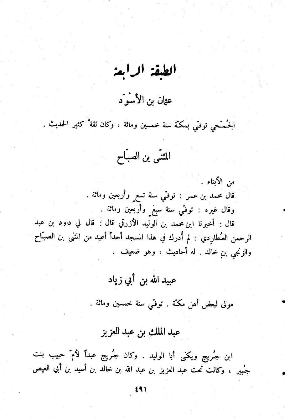 قَالَ: أَخْبَرَنَا ابْنُ مُحَمَّدِ بْنِ الْوَلِيدِ الْأَزْرَقِيُّ، قَالَ: قَالَ لِي دَاوُدُ بْنُ عَبْدِ الرَّحْمَنِ الْعُطَارِدِيُّ: §لَمْ أُدْرِكْ فِي هَذَا الْمَسْجِدِ أَحَدًا أَعْبَدَ مِنَ الْمُثَنَّى بْنِ الصَّبَّاحِ وَالزِّنْجِيِّ بْنِ خَالِدٍ لَهُ أَحَادِيثُ وَهُوَ ضَعِيفٌ