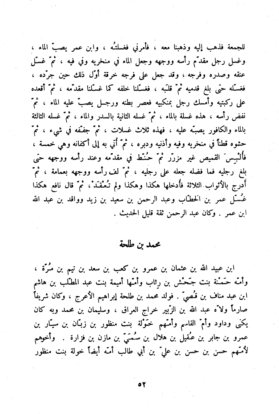 لِلْجُمُعَةِ , فَذَهَبَ إِلَيْهِ , وَذَهَبْنَا مَعَهُ , فَأَمَرَنِي , §فَغَسَلْتُهُ وَابْنُ عُمَرَ يَصُبُّ الْمَاءَ وَغَسَلَ رَجُلٌ مُقَدَّمَ رَأْسِهِ وَوَجْهَهُ , وَجَعَلَ الْمَاءَ فِي مَنْخِرَيْهِ وَفِي فِيهِ , ثُمَّ غَسَلَ عُنُقَهُ وَصَدْرَهُ وَفَرْجَهُ , وَقَدْ جَعَلَ عَلَى فَرْجِهِ خِرْقَةً أَوَّلَ ذَلِكَ حِينَ جَرَّدَهُ , فَغَسَلَهُ حَتَّى بَلَغَ قَدَمَيْهِ , ثُمَّ قَلَبَهُ , فَغَسَّلْنَا خَلْفَهُ كَمَا غَسَّلْنَا مُقَدَّمَهُ , ثُمَّ أَقْعَدَهُ عَلَى رُكْبَتَيْهِ وَأَمْسَكَ رَجُلٌ بِمَنْكِبَيْهِ فَعَصَرَ بَطْنَهُ , وَرَجُلٌ يَصُبُّ عَلَيْهِ الْمَاءَ , ثُمَّ نَفَضَ رَأْسَهُ هَذِهِ غَسْلَةٌ بِالْمَاءِ , ثُمَّ غَسَّلَهُ الثَّانِيَةَ بِالسِّدْرِ وَالْمَاءِ , ثُمَّ غَسَّلَهُ الثَّالِثَةَ بِالْمَاءِ وَالْكَافُورِ يُصِبْهُ عَلَيْهِ فَهَذِهِ ثَلَاثُ غَسَلَاتٍ , ثُمَّ جَفَّفَهُ فِي شَيْءٍ , ثُمَّ حَشَوْهُ قُطْنًا فِي مَنْخِرَيْهِ وَفِيهِ وَأُذُنَيْهِ وَدُبُرِهِ , ثُمَّ أُتِيَ بِهِ إِلَى أَكْفَانِهِ وَهِيَ خَمْسَةٌ , فَأُلْبِسَ الْقَمِيصَ غَيْرَ مُزَرَّرٍ , ثُمَّ حُنِّطَ فِي مُقَدَّمَهِ , وَعِنْدَ رَأْسِهِ وَوَجْهِهِ حَتَّى بَلَغَ رِجْلَيْهِ , فَمَا فَضَّلَهُ جَعَلَهُ عَلَى رِجْلَيْهِ , ثُمَّ لَفَّ رَأْسَهُ وَوَجْهَهُ بِعِمَامَةٍ , ثُمَّ أُدْرِجَ بِالْأَثْوَابِ الثَّلَاثَةِ , فَأَدْخَلَهَا هَكَذَا وَهَكَذَا , وَلَمْ تُعْقَدْ , ثُمَّ قَالَ نَافِعٌ: هَكَذَا غُسِّلَ عُمَرُ بْنُ الْخَطَّابِ , وَعَبْدُ الرَّحْمَنِ بْنُ سَعِيدِ بْنِ زَيْدٍ , وَوَاقِدُ بْنُ عَبْدِ اللَّهِ بْنِ عُمَرَ , وَكَانَ عَبْدُ الرَّحْمَنِ ثِقَةً قَلِيلَ الْحَدِيثِ "