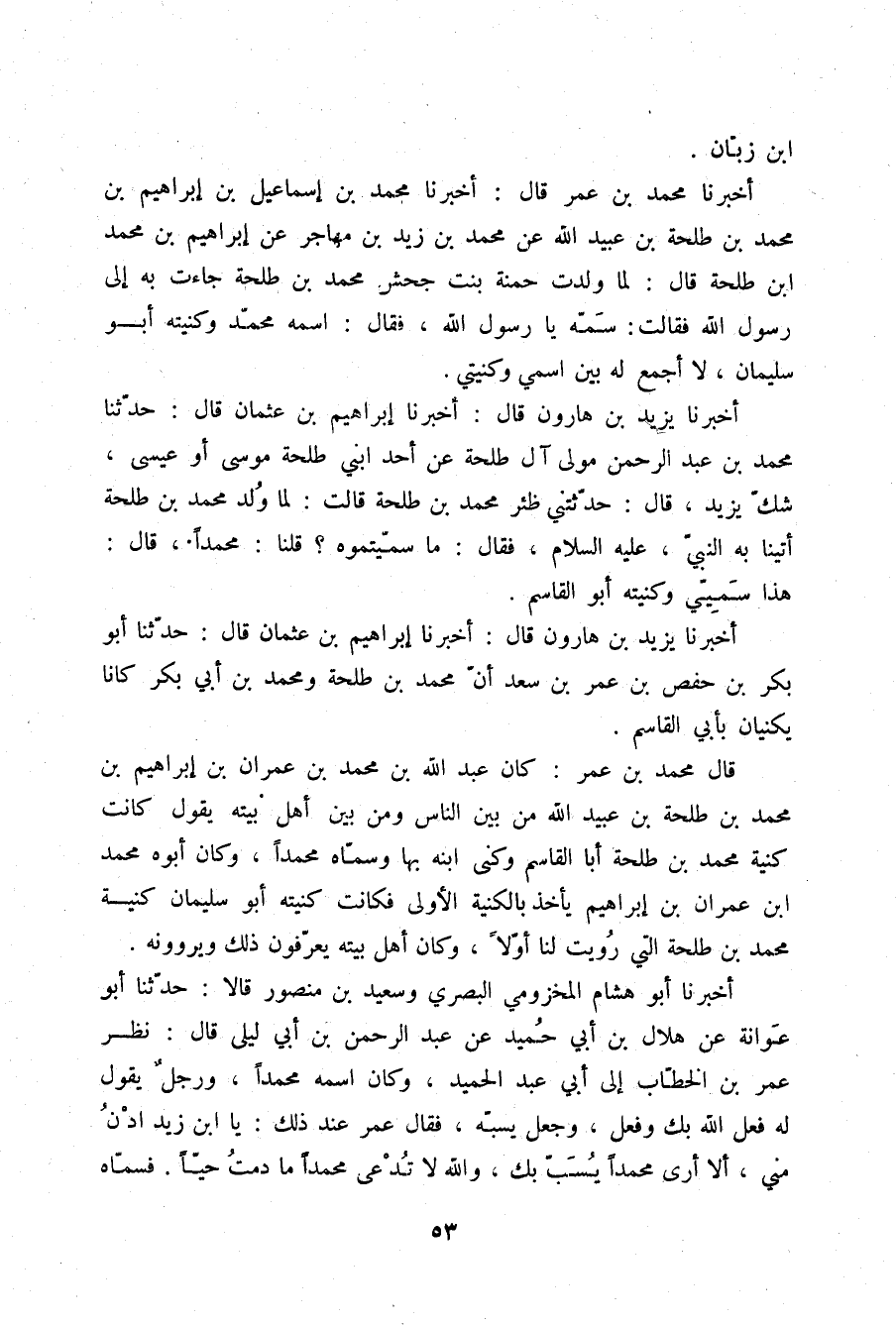أَخْبَرَنَا يَزِيدُ بْنُ هَارُونَ قَالَ: أَخْبَرَنَا إِبْرَاهِيمُ بْنُ عُثْمَانَ قَالَ: حَدَّثَنَا مُحَمَّدُ بْنُ عَبْدِ الرَّحْمَنِ مَوْلَى آلِ طَلْحَةَ , عَنْ أَحَدِ ابْنَيْ طَلْحَةَ مُوسَى أَوْ عِيسَى - شَكَّ يَزِيدُ - قَالَ: حَدَّثَتْنِي ظِئْرُ مُحَمَّدِ بْنِ طَلْحَةَ قَالَتْ: " لَمَّا وُلِدَ مُحَمَّدُ بْنُ طَلْحَةَ أَتَيْنَا بِهِ النَّبِيَّ عَلَيْهِ السَّلَامُ , فَقَالَ: «مَا سَمَّيْتُمُوهُ؟» قُلْنَا: مُحَمَّدًا. قَالَ: «§هَذَا سَمِيَّتِي , وَكُنْيَتُهُ أَبُو الْقَاسِمِ» أَخْبَرَنَا يَزِيدُ بْنُ هَارُونَ قَالَ: أَخْبَرَنَا إِبْرَاهِيمُ بْنُ عُثْمَانَ قَالَ: حَدَّثَنَا أَبُو بَكْرِ بْنُ حَفْصِ بْنِ عُمَرَ بْنِ سَعْدٍ: أَنَّ مُحَمَّدَ بْنَ طَلْحَةَ وَمُحَمَّدَ بْنَ أَبِي بَكْرٍ كَانَا يُكَنَّيَانِ بِأَبِي الْقَاسِمِ ". قَالَ مُحَمَّدُ بْنُ عُمَرَ: كَانَ عَبْدُ اللَّهِ بْنُ مُحَمَّدِ بْنِ عِمْرَانَ بْنِ إِبْرَاهِيمَ بْنِ مُحَمَّدِ بْنِ طَلْحَةَ بْنِ عُبَيْدِ اللَّهِ مِنْ بَيْنِ النَّاسِ وَمِنْ بَيْنِ أَهْلِ بَيْتِهِ يَقُولُ: كَانَتْ كُنْيَةُ مُحَمَّدِ بْنِ طَلْحَةَ أَبَا الْقَاسِمِ , وَكَنَّى ابْنَهُ بِهَا وَسَمَّاهُ مُحَمَّدًا , وَكَانَ أَبُوهُ مُحَمَّدُ بْنُ عِمْرَانَ بْنِ إِبْرَاهِيمَ يَأْخُذُ بِالْكُنْيَةِ الْأُولَى , فَكَانَتْ كُنْيَتُهُ أَبُو سُلَيْمَانَ كُنْيَةَ مُحَمَّدِ بْنِ طَلْحَةَ الَّتِي رُوِيَتْ لَنَا أَوَّلًا , وَكَانَ أَهْلُ بَيْتِهِ يَعْرِفُونَ ذَلِكَ وَيَرْوُونَهُ