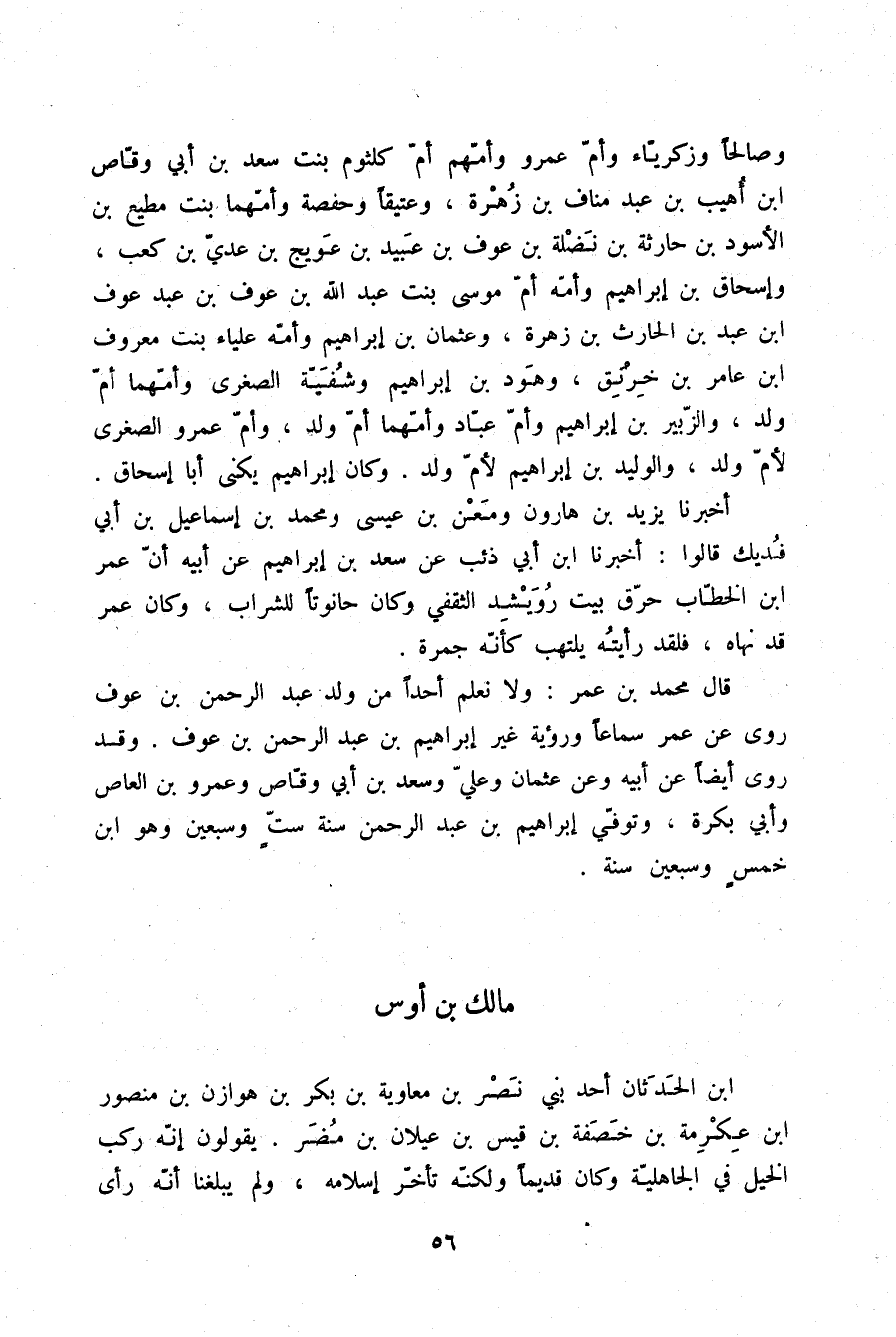§مَالِكُ بْنُ أَوْسِ بْنِ الْحَدَثَانِ أَحَدُ بَنِي نَصْرِ بْنِ مُعَاوِيَةَ بْنِ بَكْرِ بْنِ هَوَازِنَ بْنِ مَنْصُورِ بْنِ عِكْرِمَةَ بْنِ خَصَفَةَ بْنِ قَيْسِ بْنِ عَيْلَانَ بْنِ مُضَرَ. يَقُولُونَ: إِنَّهُ رَكِبَ الْخَيْلَ فِي الْجَاهِلِيَّةِ , وَكَانَ قَدِيمًا وَلَكِنَّهُ تَأَخَّرَ إِسْلَامُهُ , وَلَمْ يَبْلُغْنَا أَنَّهُ رَأَى -[57]- النَّبِيَّ عَلَيْهِ السَّلَامُ , وَلَا رَوَى عَنْهُ شَيْئًا , وَقَدْ رَوَى عَنْ عُمَرَ بْنِ الْخَطَّابِ , وَعُثْمَانَ بْنِ عَفَّانَ , وَمَاتَ بِالْمَدِينَةِ سَنَةَ اثْنَتَيْنِ وَسَبْعِينَ