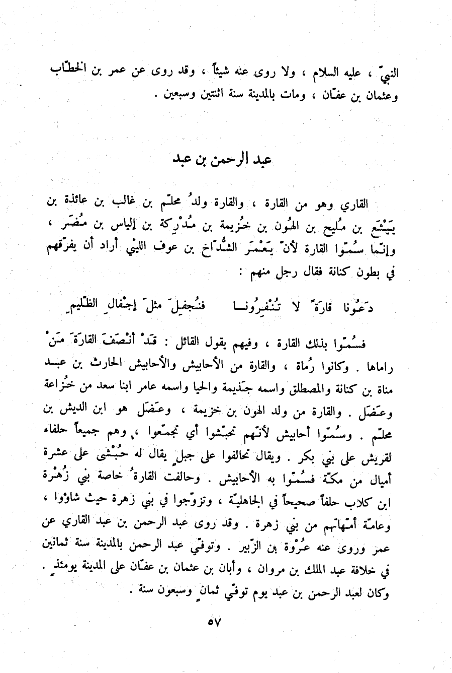 فَسُمُّوا بِذَلِكَ الْقَارَةَ , وَفِيهِمْ يَقُولُ الْقَائِلُ: قَدْ أَنْصَفَ الْقَارَةَ مَنْ رَامَاهَا , وَكَانُوا رُمَاةً , وَالْقَارَةُ مِنَ الْأَحَابِيشِ , وَالْأَحَابِيشُ: الْحَارِثُ بْنُ عَبْدِ مَنَاةَ بْنِ كِنَانَةَ , وَالْمُصْطَلِقُ وَاسْمُهُ جَذِيمَةُ , وَالْحَيَا وَاسْمُهُ عَامِرٌ ابْنَا سَعْدٍ مِنْ خُزَاعَةَ وَعَضَلَ , وَالْقَارَةُ مِنْ وَلَدِ الْهُونِ بْنِ خُزَيْمَةَ , وَعَضَلُ هُوَ ابْنُ الدِّيشِ بْنِ مُحَلَّمٍ , وَسُمُّوا أَحَابِيشَ؛ لِأَنَّهُمْ تَحَبَّشُوا أَيْ: تَجَمَّعُوا وَهُمْ جَمِيعًا حُلَفَاءُ لِقُرَيْشٍ عَلَى بَنِي بَكْرٍ , وَيُقَالُ: تَحَالَفُوا عَلَى جَبَلٍ يُقَالُ لَهُ حُبْشِيٌّ عَلَى عَشَرَةِ أَمْيَالٍ مِنْ مَكَّةَ فَسُمُّوا بِهِ الْأَحَابِيشَ وَحَالَفَتِ الْقَارَةُ خَاصَّةَ بَنِي زُهْرَةَ بْنِ كِلَابٍ حِلْفًا صَحِيحًا فِي الْجَاهِلِيَّةِ , وَتَزَوَّجُوا فِي بَنِي زُهْرَةَ حَيْثُ شَاءُوا , وَعَامَّةُ أُمَّهَاتِهِمْ مِنْ بَنِي زُهْرَةَ , وَقَدْ رَوَى عَبْدُ الرَّحْمَنِ بْنُ عَبْدٍ الْقَارِيُّ عَنْ عُمَرَ , وَرَوَى عَنْهُ عُرْوَةُ بْنُ الزُّبَيْرِ , وَتُوُفِّيَ عَبْدُ الرَّحْمَنِ بِالْمَدِينَةِ سَنَةَ ثَمَانِينَ فِي خِلَافَةِ عَبْدِ الْمَلِكِ بْنِ مَرْوَانَ وَأَبَانَ بْنِ عُثْمَانَ بْنِ عَفَّانَ عَلَى الْمَدِينَةِ يَوْمَئِذٍ , وَكَانَ لِعَبْدِ الرَّحْمَنِ بْنِ عَبْدٍ الْقَارِيِّ يَوْمَ تُوُفِّيَ ثَمَانٍ وَسَبْعُونَ سَنَةً