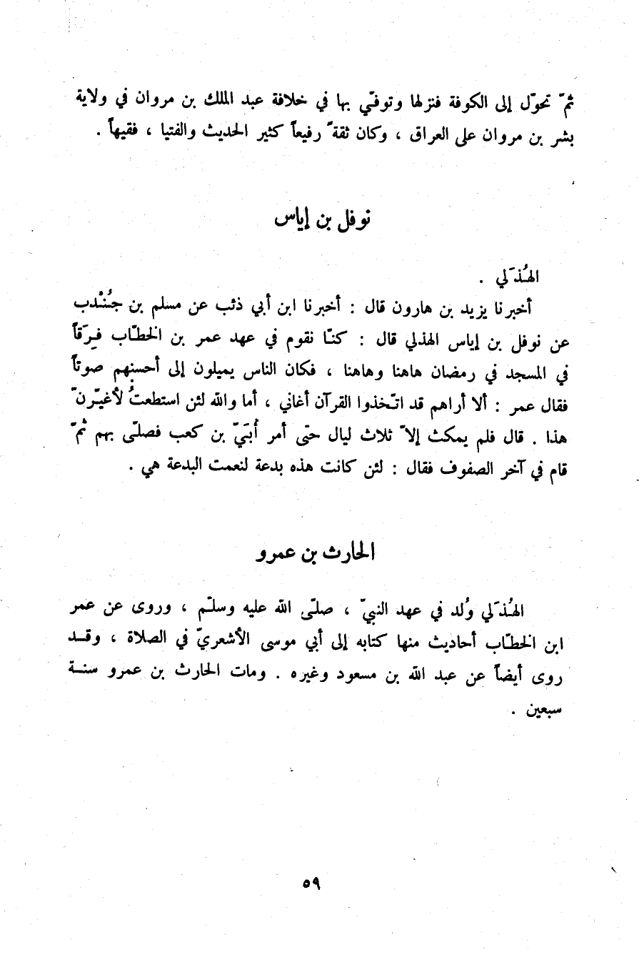 أَخْبَرَنَا يَزِيدُ بْنُ هَارُونَ قَالَ: أَخْبَرَنَا ابْنُ أَبِي ذِئْبٍ , عَنْ مُسْلِمِ بْنِ جُنْدُبٍ , عَنْ نَوْفَلِ بْنِ إِيَاسٍ الْهُذَلِيِّ قَالَ: كُنَّا نَقُومُ فِي عَهْدِ عُمَرَ بْنِ الْخَطَّابِ فِرَقًا فِي الْمَسْجِدِ فِي رَمَضَانَ هَاهُنَا وَهَاهُنَا , فَكَانَ النَّاسُ يَمِيلُونَ إِلَى أَحْسَنِهِمْ صَوْتًا , فَقَالَ عُمَرُ: §أَلَا أُرَاهُمْ قَدِ اتَّخَذُوا الْقُرْآنَ أَغَانِيَ , أَمَا وَاللَّهِ لَئِنِ اسْتَطَعْتُ لَأُغَيِّرَنَّ هَذَا. قَالَ: فَلَمْ يَمْكُثْ إِلَّا ثَلَاثَ لَيَالٍ حَتَّى أَمَرَ أُبَيَّ بْنَ كَعْبٍ فَصَلَّى بِهِمْ , ثُمَّ قَامَ فِي آخِرِ الصُّفُوفِ , فَقَالَ: لَئِنْ كَانَتْ هَذِهِ بِدْعَةً لَنِعْمَتِ الْبِدْعَةُ هِيَ "