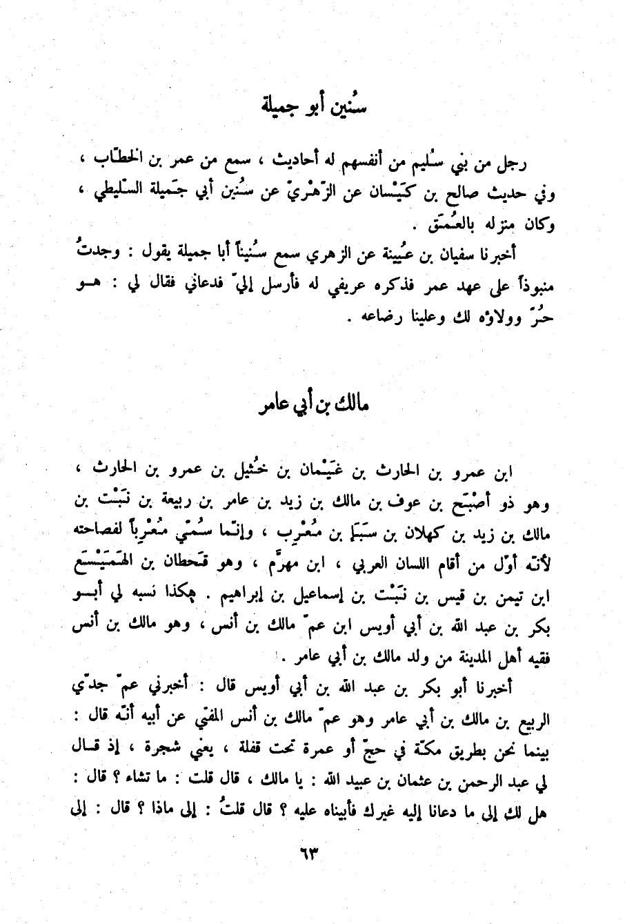 أَخْبَرَنَا أَبُو بَكْرِ بْنُ عَبْدِ اللَّهِ بْنِ أَبِي أُوَيْسٍ قَالَ: أَخْبَرَنِي عَمُّ جَدِّي: الرَّبِيعُ بْنُ مَالِكِ بْنِ أَبِي عَامِرٍ وَهُوَ عَمُّ مَالِكِ بْنِ أَنَسٍ الْمُفْتِي عَنْ أَبِيهِ أَنَّهُ قَالَ: بَيْنَمَا نَحْنُ بِطَرِيقِ مَكَّةَ فِي حَجٍّ أَوْ عَمْرَةٍ تَحْتَ قَفْلَةٍ يَعْنِي شَجَرَةً إِذْ قَالَ: لِي عَبْدُ الرَّحْمَنِ بْنُ عُثْمَانَ بْنِ عُبَيْدِ اللَّهِ: يَا مَالِكُ. قَالَ: قُلْتُ: مَا تَشَاءُ؟ قَالَ: هَلْ لَكَ إِلَى مَا دَعَانَا إِلَيْهِ غَيْرُكَ؟ فَأَبَيْنَاهُ عَلَيْهِ. قَالَ: قُلْتُ إِلَى مَاذَا؟ قَالَ: §إِلَى -[64]- أَنْ يَكُونَ دَمُّنَا دَمَّكَ , وَهَدْمُنَا هَدْمَكَ , وَبِاللَّهِ الْقَائِلِ مَا بَلَّ بَحْرٌ صُوفَةً " قَالَ: مَالَكَ , فَأَجَبْتُهُ إِلَى ذَلِكَ , فَعِدَادُهُمُ الْيَوْمَ فِي بَنِي تَيْمٍ لِهَذَا السَّبَبِ "