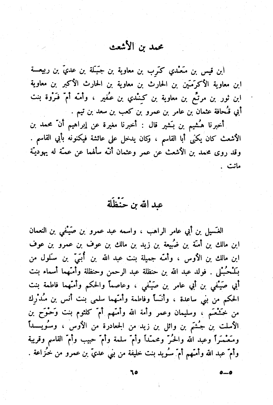 §عَبْدُ اللَّهِ بْنُ حَنْظَلَةَ الْغَسِيلِ بْنِ أَبِي عَامِرٍ الرَّاهِبُ , وَاسْمُهُ عَبْدُ عَمْرِو بْنِ صَيْفِيِّ بْنِ النُّعْمَانِ بْنِ مَالِكِ بْنِ أَمَةَ بْنِ ضُبَيْعَةَ بْنِ زَيْدِ بْنِ مَالِكِ بْنِ عَوْفِ بْنِ عَمْرِو بْنِ عَوْفِ بْنِ مَالِكِ بْنِ الْأَوْسِ , وَأُمُّهُ جَمِيلَةُ بِنْتُ عَبْدِ اللَّهِ بْنِ أُبَيِّ ابْنِ سَلُولَ مِنْ بَلْحُبْلَى , فَوَلَدَ عَبْدُ اللَّهِ بْنُ حَنْظَلَةَ عَبْدَ الرَّحْمَنِ , وَحَنْظَلَةَ وَأُمُّهُمَا أَسْمَاءُ بِنْتُ أَبِي صَيْفِيِّ بْنِ أَبِي عَامِرِ بْنِ صَيْفِيٍّ , وَعَاصِمًا , وَالْحَكَمَ وَأُمُّهُمَا فَاطِمَةُ بِنْتُ الْحَكَمِ مِنْ بَنِي سَاعِدَةَ , وَأَنَسًا , وَفَاطِمَةَ وَأُمُّهُمَا سَلْمَى بِنْتُ أَنَسِ بْنِ مُدْرِكٍ مِنْ خَثْعَمَ , وَسُلَيْمَانَ , وَعُمَرَ , وَأَمَةَ اللَّهِ وَأُمُّهُمْ أُمُّ كُلْثُومٍ بِنْتُ وَحْوَحِ بْنِ الْأَسَلْتِ بْنِ جُشَمَ بْنِ وَائِلِ بْنِ زَيْدٍ مِنَ الْجَعَادِرَةِ مِنَ الْأَوْسِ , وَسُوَيْدًا , وَمَعْمَرًا , وَعَبْدَ اللَّهِ , وَالْحُرَّ , وَمُحَمَّدًا , وَأُمَّ سَلَمَةَ , وَأُمَّ حَبِيبٍ , وَأُمَّ الْقَاسِمِ , وَقَرِيبَةَ , وَأُمَّ عَبْدِ اللَّهِ وَأُمُّهُمْ أُمُّ سُوَيْدٍ بِنْتُ خَلِيفَةَ مِنْ بَنِي عَدِيِّ بْنِ عَمْرٍو مِنْ خُزَاعَةَ ,