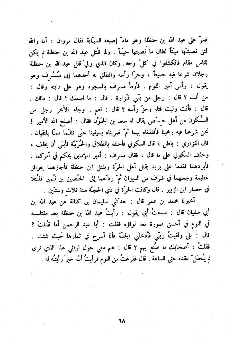 فَمَرَّ عَلَى عَبْدِ اللَّهِ بْنِ حَنْظَلَةَ وَهُوَ مَادٌّ إِصْبَعَهُ السَّبَّابَةَ , فَقَالَ مَرْوَانُ: أَمَا وَاللَّهِ , لَئِنْ نَصَبْتَهَا مَيِّتًا لَطَالَ مَا نَصَبْتَهَا حَيًّا , وَلَمَّا قُتِلَ عَبْدُ اللَّهِ بْنُ حَنْظَلَةَ لَمْ يَكُنْ لِلنَّاسِ مَقَامٌ , فَانْكَشَفُوا فِي كُلِّ وَجْهٍ وَكَانَ الَّذِي وَلِيَ قَتْلَ عَبْدِ اللَّهِ بْنِ حَنْظَلَةَ رَجُلَانِ شُرَّعًا فِيهِ جَمِيعًا وَحَزَّا رَأْسَهُ , وَانْطَلَقَ بِهِ أَحَدُهُمَا إِلَى مُسْرِفٍ وَهُوَ يَقُولُ: رَأْسُ أَمِيرِ الْقَوْمِ , فَأَوْمَأَ مُسْرِفٌ بِالسُّجُودِ , وَهُوَ عَلَى دَابَّتِهِ , وَقَالَ: مَنْ أَنْتَ؟ قَالَ: رَجُلٌ مِنْ بَنِي فَزَارَةَ. قَالَ: مَا اسْمُكَ؟ قَالَ: مَالِكٌ. قَالَ: فَأَنْتَ وَلَّيْتَ قَتْلَهُ وَحَزَّ رَأْسِهِ؟ قَالَ: نَعَمْ. وَجَاءَ الْآخَرُ رَجُلٌ مِنَ السُّكُونِ , مِنْ أَهْلِ حِمْصَ , يُقَالُ لَهُ سَعْدُ بْنُ الْجَوْنِ , فَقَالَ: أَصْلَحَ اللَّهُ الْأَمِيرَ , نَحْنُ شَرَعْنَا فِيهِ رُمْحَيْنَا , فَأَنْفَذْنَاهُ بِهِمَا , ثُمَّ ضَرَبْنَاهُ بِسَيْفِينَا حَتَّى تَثَلَّمَا مِمَّا يَلْتَقِيَانِ. قَالَ الْفَزَارِيُّ: بَاطِلٌ. قَالَ السَّكُونِيُّ: فَأَحْلَفَهُ بِالطَّلَاقِ وَالْحُرِّيَةِ , فَأَبَى أَنْ يَحْلِفَ وَحَلَفَ السَّكُونِيُّ عَلَى مَا قَالَ , فَقَالَ مُسْرِفٌ: أَمِيرُ الْمُؤْمِنِينَ يَحْكُمُ فِي أَمْرِكُمَا , فَأَبْرَدَهُمَا , فَقَدِمَا عَلَى يَزِيدَ بِقَتْلِ أَهْلِ الْحَرَّةِ , وَبِقَتْلِ ابْنِ حَنْظَلَةَ , فَأَجَازَهُمَا بِجَوَائِزَ عَظِيمَةٍ , وَجَعَلَهُمَا فِي شَرَفٍ مِنَ الدِّيوَانِ , ثُمَّ رَدَّهُمَا إِلَى الْحُصَيْنِ بْنِ نُمَيْرٍ , فَقُتِلَا فِي حِصَارِ ابْنِ الزُّبَيْرِ " قَالَ: وَكَانَتِ الْحَرَّةُ فِي ذِي الْحِجَّةِ سَنَةَ ثَلَاثٍ وَسِتِّينَ
