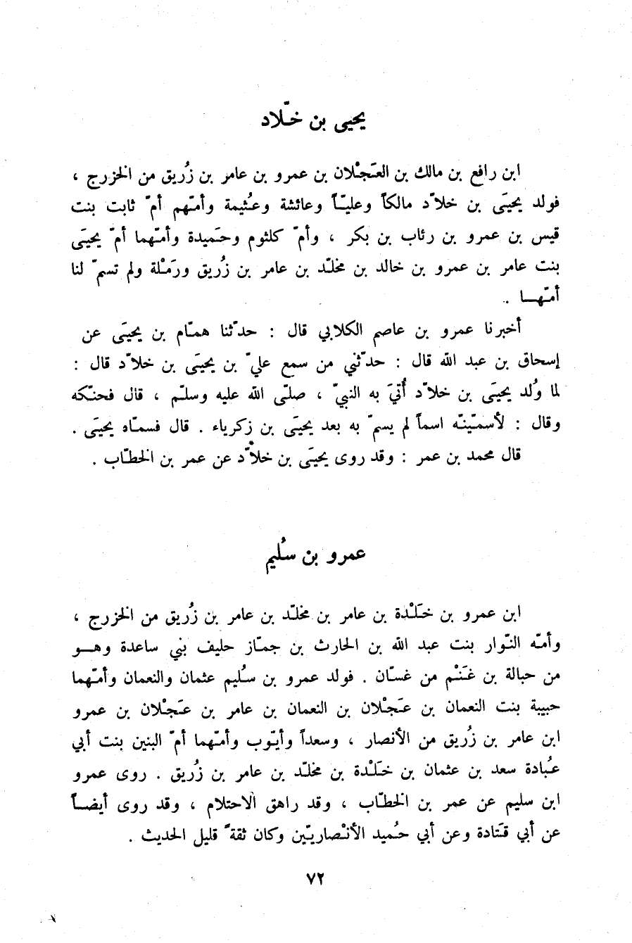 §عَمْرُو بْنُ سُلَيْمِ بْنِ عَمْرِو بْنِ خَلْدَةَ بْنِ عَامِرِ بْنِ مَخْلَدِ بْنِ عَامِرِ بْنِ زُرَيْقٍ مِنَ الْخَزْرَجِ وَأُمُّهُ النَّوَّارُ بِنْتُ عَبْدِ اللَّهِ بْنِ الْحَارِثِ بْنِ جَمَّازٍ حَلِيفُ بَنِي سَاعِدَةَ وَهُوَ مِنْ حُبَالَةَ بْنِ غَنْمٍ مِنْ غَسَّانَ , فَوَلَدَ عَمْرُو بْنُ سُلَيْمٍ عُثْمَانَ , وَالنُّعْمَانَ وَأُمُّهُمَا حَبِيبَةُ بِنْتُ النُّعْمَانِ بْنِ عَجْلَانَ بْنِ النُّعْمَانِ بْنِ عَامِرِ بْنِ عَجْلَانَ بْنِ عَمْرِو بْنِ عَامِرِ بْنِ زُرَيْقٍ مِنَ الْأَنْصَارِ , وَسَعْدًا , وَأَيُّوبَ وَأُمُّهُمَا أُمُّ الْبَنِينَ بِنْتُ أَبِي عُبَادَةَ سَعْدِ بْنِ عُثْمَانَ بْنِ خَلْدَةَ بْنِ مَخْلَدِ بْنِ عَامِرِ بْنِ زُرَيْقٍ رَوَى عَمْرُو بْنُ سُلَيْمٍ عَنْ عُمَرَ بْنِ الْخَطَّابِ , وَقَدْ رَاهَقَ الِاحْتِلَامَ , وَقَدْ رَوَى أَيْضًا عَنْ أَبِي قَتَادَةَ وَعَنْ أَبِي حُمَيْدٍ الْأَنْصَارِيَّيْنِ , وَكَانَ ثِقَةً قَلِيلَ الْحَدِيثِ
