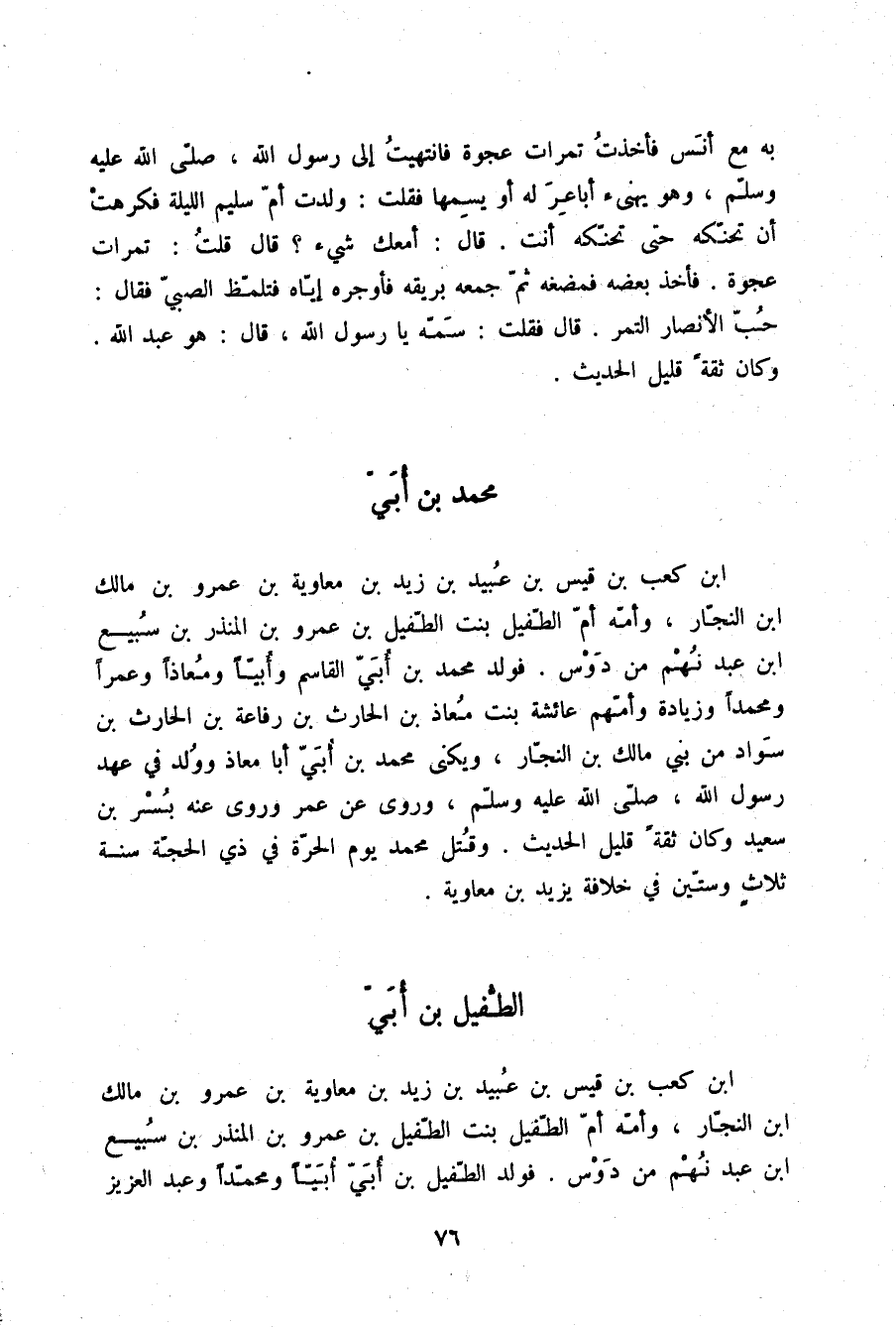 §الطُّفَيْلُ بْنُ أُبَيِّ بْنِ كَعْبِ بْنِ قَيْسِ بْنِ عُبَيْدِ بْنِ زَيْدِ بْنِ مُعَاوِيَةَ بْنِ عَمْرِو بْنِ مَالِكِ بْنِ النَّجَّارِ وَأُمُّهُ أُمُّ الطُّفَيْلِ بِنْتُ الطُّفَيْلِ بْنِ عَمْرِو بْنِ الْمُنْذِرِ بْنِ سُبَيْعِ بْنِ عَبْدِ نُهْمٍ مِنْ دَوْسٍ , فَوَلَدَ الطُّفَيْلُ بْنُ أُبِيٍّ , أُبَيًّا , وَمُحَمَّدًا , وَعَبْدَ الْعَزِيزِ , -[77]- وَعُثْمَانَ , وَأُمَّ عَمْرٍو وَأُمُّهُمْ أُمُّ الْقَاسِمِ بِنْتُ مُحَمَّدِ بْنِ أَبِي ذَرَّةَ بْنِ مُعَاذِ بْنِ زُرَارَةَ مِنْ بَنِي ظُفُرَ مِنَ الْأَوْسِ , وَكَانَ الطُّفَيْلُ بْنُ أُبَيٍّ يُلَقَّبُ أَبَا بَطْنٍ , وَكَانَ صَدِيقًا لِعَبْدِ اللَّهِ بْنِ عُمَرَ , وَرَوَى عَنْ عُمَرَ بْنِ الْخَطَّابِ , وَعَنْ أَبِيهِ , وَعَنِ ابْنِ عُمَرَ , وَكَانَ ثِقَةً صَالِحَ الْحَدِيثِ