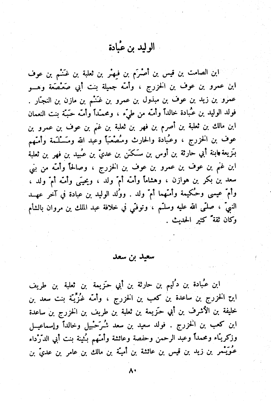 §الْوَلِيدُ بْنُ عُبَادَةَ بْنِ الصَّامِتِ بْنِ قَيْسِ بْنِ أَصْرَمَ بْنِ فِهْرِ بْنِ ثَعْلَبَةَ بْنِ غَنْمِ بْنِ عَوْفِ بْنِ عَمْرِو بْنِ عَوْفِ بْنِ الْخَزْرَجِ وَأُمُّهُ جَمِيلَةُ بِنْتُ أَبِي صَعْصَعَةَ وَهُوَ عَمْرُو بْنُ زَيْدِ بْنِ عَوْفِ بْنِ مَبْذُولِ بْنِ عَمْرِو بْنِ غَنْمِ بْنِ مَازِنِ بْنِ النَّجَّارِ , فَوَلَدَ الْوَلِيدُ بْنُ عُبَادَةَ خَالِدًا وَأُمُّهُ مِنْ طَيِّئٍ , وَمُحَمَّدًا وَأُمُّهُ حَبَّةُ بِنْتُ النُّعْمَانِ بْنِ مَالِكِ بْنِ ثَعْلَبَةَ بْنِ أَصْرَمَ بْنِ فِهْرِ بْنِ ثَعْلَبَةَ بْنِ غَنْمِ بْنِ عَوْفِ بْنِ عَمْرِو بْنِ عَوْفِ بْنِ الْخَزْرَجِ , وَعُبَادَةَ , وَالْحَارِثَ , وَمُصْعَبًا , وَعَبْدَ اللَّهِ , وَمَسْلَمَةَ وَأُمُّهُمْ بَزِيعَةُ ابْنَةُ أَبِي حَارِثَةَ بْنِ أَوْسِ بْنِ سَكَنِ بْنِ عَدِيِّ بْنِ عُبَيْدِ بْنِ فِهْرِ بْنِ ثَعْلَبَةَ بْنِ غَنْمِ بْنِ عَوْفِ بْنِ عَمْرِو بْنِ عَوْفِ بْنِ الْخَزْرَجِ , وَصَالِحًا وَأُمُّهُ مِنْ بَنِي سَعْدِ بْنِ بَكْرِ بْنِ هَوَازِنَ , وَهِشَامًا وَأُمُّهُ أُمُّ وَلَدٍ , وَيَحْيَى وَأُمُّهُ أُمُّ وَلَدٍ , وَأُمَّ عِيسَى , وَحَكِيمَةَ وَأُمُّهُمَا أُمُّ وَلَدٍ , وَوُلِدَ الْوَلِيدُ بْنُ عُبَادَةَ فِي آخِرِ عَهْدِ النَّبِيِّ صلّى الله عليه وسلم وَتُوُفِّيَ فِي خِلَافَةِ عَبْدِ الْمَلِكِ بْنِ مَرْوَانَ بِالشَّامِ , وَكَانَ ثِقَةً كَثِيرَ الْحَدِيثِ