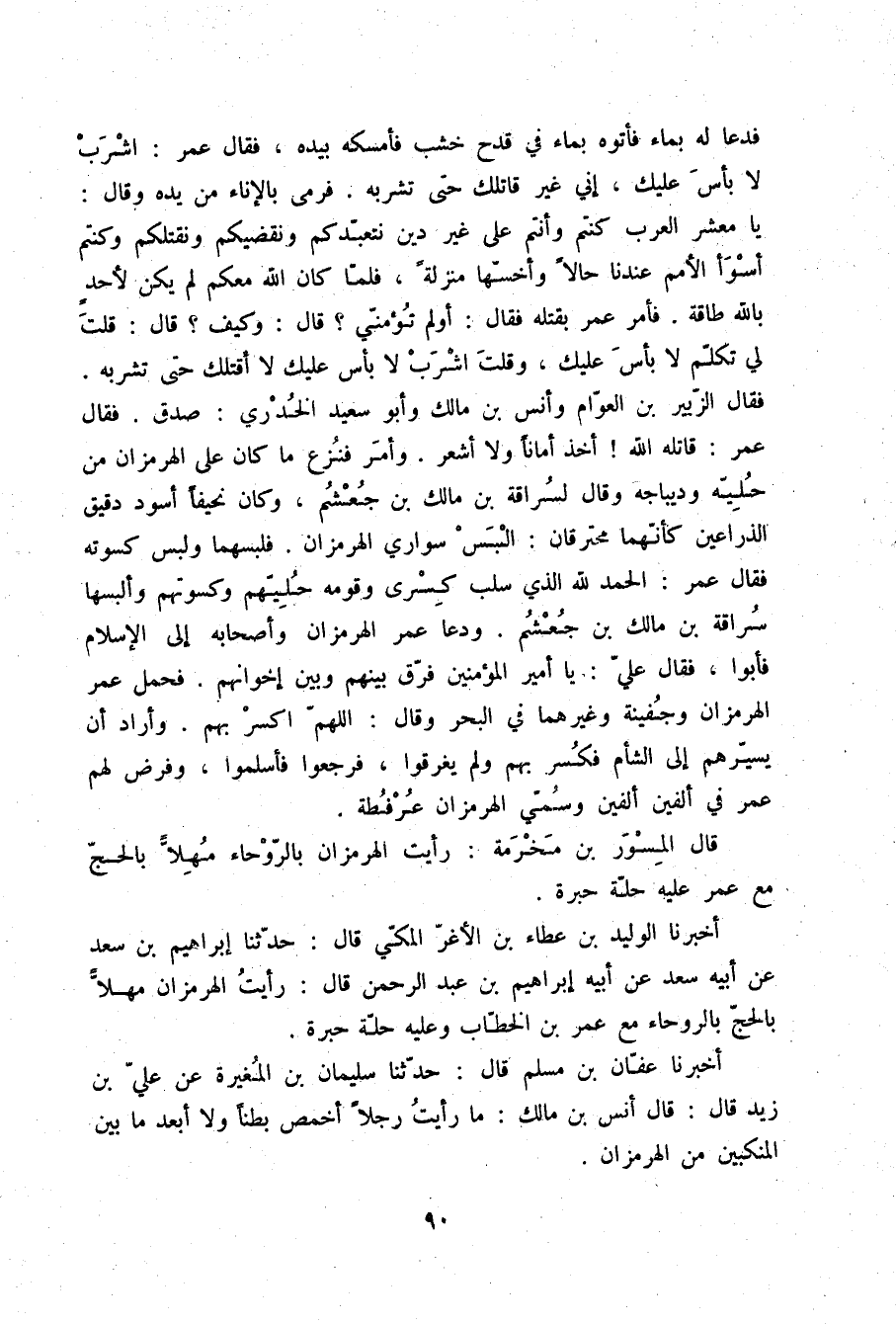 فَدَعَا لَهُ بِمَاءٍ , فَأَتَوْهُ بِمَاءٍ فِي قَدَحِ خَشَبٍ , فَأَمْسَكَهُ بِيَدِهِ , فَقَالَ عُمَرُ: اشْرَبْ , لَا بَأْسَ عَلَيْكَ إِنِّي غَيْرُ قَاتِلِكَ حَتَّى تَشْرَبَهُ , فَرَمَى الْإِنَاءَ مِنْ يَدِهِ , وَقَالَ: يَا مَعْشَرَ الْعَرَبِ , كُنْتُمْ وَأَنْتُمْ عَلَى غَيْرِ دِينٍ نَتَعَبَّدُكُمْ وَنَقْضِيكُمْ وَنَقْتُلُكُمْ , وَكُنْتُمْ أَسْوَأَ الْأُمَمِ عِنْدَنَا حَالًا وَأَخَسَّهَا مَنْزِلَةً , فَلَمَّا كَانَ اللَّهُ مَعَكُمْ لَمْ يَكُنْ لِأَحَدٍ بِاللَّهِ طَاقَةٌ , فَأَمَرَ عُمَرُ بِقَتْلِهِ , فَقَالَ أَوَ لَمْ تُؤَمِّنِّي؟ قَالَ: وَكَيْفَ؟ قَالَ: قُلْتَ لِي: تَكَلَّمْ؛ لَا بَأْسَ عَلَيْكَ , وَقُلْتَ: اشْرَبْ؛ لَا بَأْسَ عَلَيْكَ , لَا أَقْتُلُكَ حَتَّى تَشْرَبَهُ , فَقَالَ الزُّبَيْرُ بْنُ الْعَوَّامِ , وَأَنَسُ بْنُ مَالِكٍ , وَأَبُو سَعِيدٍ الْخُدْرِيُّ صَدَقَ , فَقَالَ عُمَرُ: قَاتَلَهُ اللَّهُ , أَخَذَ أَمَانًا وَلَا أَشْعُرُ , وَأَمَرَ فَنُزِعَ مَا كَانَ عَلَى الْهُرْمُزَانِ مِنْ حُلِيِّهِ وَدِيبَاجِهِ , وَقَالَ لِسُرَاقَةَ بْنِ مَالِكِ بْنِ جُعْشُمٍ , وَكَانَ نَحِيفًا أَسْوَدَ دَقِيقَ الذِّرَاعَيْنِ كَأَنَّهُمَا مُحْتَرِقَانِ: الْبَسْ سَوَارِيِ الْهُرْمُزَانِ , فَلَبِسَهُمَا , وَلَبِسَ كِسْوَتَهُ , فَقَالَ عُمَرُ: الْحَمْدُ لِلَّهِ الَّذِي سَلَبَ كِسْرَى وَقَوْمَهُ حُلِيَّهُمْ وَكِسَوَتَهُمْ , وَأَلْبَسَهَا سُرَاقَةَ بْنَ مَالِكِ بْنِ جُعْشُمٍ , وَدَعَا عُمَرُ الْهُرْمُزَانَ وَأَصْحَابَهُ إِلَى الْإِسْلَامِ , فَأَبَوْا , فَقَالَ عَلِيٌّ: يَا أَمِيرَ الْمُؤْمِنِينَ , فَرِّقْ بَيْنَهُمْ وَبَيْنَ إِخْوَانِهِمْ , فَحَمَلَ عُمَرُ الْهُرْمُزَانَ وَجُفَيْنَةَ وَغَيْرَهُمَا فِي الْبَحْرِ , وَقَالَ: «اللَّهُمَّ , اكْسِرْ بِهِمْ» , وَأَرَادَ أَنْ يُسَيِّرَهُمْ إِلَى الشَّامِ فَكُسِرَ بِهِمْ , وَلَمْ يَغْرَقُوا , فَرَجَعُوا , فَأَسْلَمُوا , وَفَرَضَ لَهُمْ عُمَرُ فِي أَلْفَيْنِ أَلْفَيْنِ , وَسُمِّيَ الْهُرْمُزَانُ عُرْفُطَةَ قَالَ الْمِسْوَرُ بْنُ مَخْرَمَةَ: رَأَيْتُ الْهُرْمُزَانَ بِالرَّوْحَاءِ مُهِلًّا بِالْحَجِّ مَعَ عُمَرَ عَلَيْهِ حُلَّةٌ حِبَرَةٌ