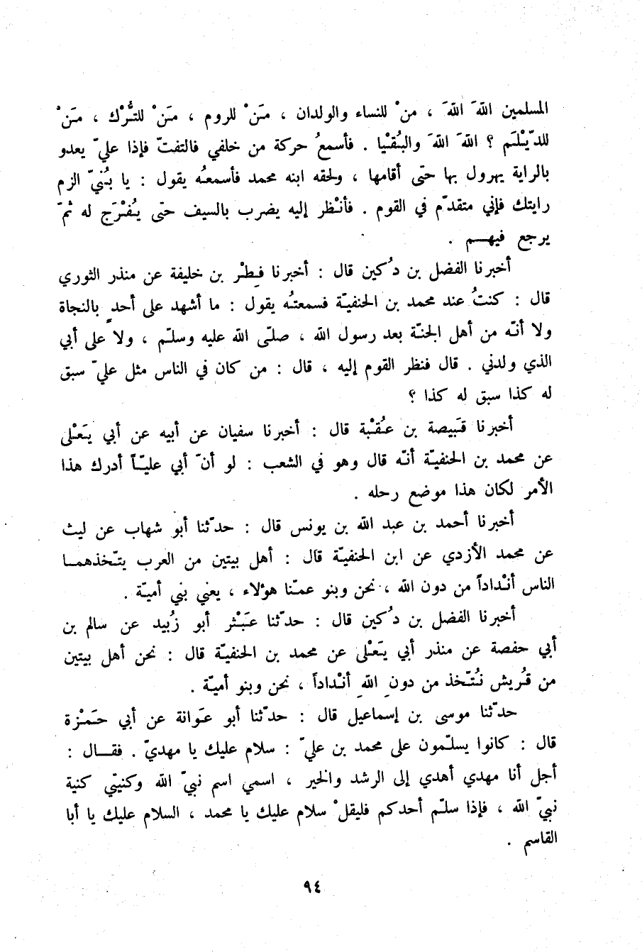 أَخْبَرَنَا الْفَضْلُ بْنُ دُكَيْنٍ قَالَ: حَدَّثَنَا عَبْثَرٌ أَبُو زُبَيْدٍ , عَنْ سَالِمِ بْنِ أَبِي حَفْصَة , عَنْ مُنْذِرٍ أَبِي يَعْلَى , عَنْ مُحَمَّدِ ابْنِ الْحَنَفِيَّةِ قَالَ: " §نَحْنُ أَهْلُ بَيْتَيْنِ مِنْ قُرَيْشٍ نَتَّخَذُ مِنْ دُونِ اللَّهِ أَنْدَادًا: نَحْنُ وَبَنُو أُمَيَّةَ "
