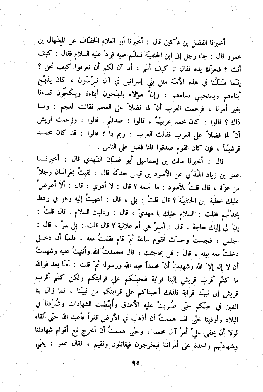 أَخْبَرَنَا الْفَضْلُ بْنُ دُكَيْنٍ قَالَ: أَخْبَرَنَا أَبُو الْعَلَاءِ الْخَفَّافُ , عَنِ الْمِنْهَالِ بْنِ عَمْرٍو قَالَ: " جَاءَ رَجُلٌ إِلَى ابْنِ الْحَنَفِيَّةِ , فَسَلَّمَ عَلَيْهِ , فَرَدَّ عَلَيْهِ السَّلَامَ , فَقَالَ: §كَيْفَ أَنْتَ؟ فَحَرَّكَ يَدَهُ , فَقَالَ: كَيْفَ أَنْتُمْ؟ أَمَا آنَ لَكُمْ أَنْ تَعْرِفُوا كَيْفَ نَحْنُ , إِنَّمَا مَثَلُنَا فِي هَذِهِ الْأُمَّةِ مَثَلُ بَنِي إِسْرَائِيلَ فِي آلِ فِرْعَوْنَ كَانَ يَذْبَحُ أَبْنَاءَهُمْ وَيَسْتَحْيِي نِسَاءَهُمْ , وَإِنَّ هَؤُلَاءِ يَذْبَحُونَ أَبْنَاءَنَا وَيَنْكِحُونَ نِسَاءَنَا بِغَيْرِ أَمْرِنَا , فَزَعَمَتِ الْعَرَبُ أَنَّ لَهَا فَضْلًا عَلَى الْعَجَمِ , فَقَالَتِ الْعَجَمُ: وَمَا ذَاكَ؟ قَالُوا: كَانَ مُحَمَّدًا عَرَبِيًّا؟ قَالُوا: صَدَقْتُمْ. قَالُوا: وَزَعَمَتْ قُرَيْشٌ أَنَّ لَهَا فَضْلًا عَلَى الْعَرَبِ , فَقَالَتِ الْعَرَبُ: وَبِمَ ذَا؟ قَالُوا: قَدْ كَانَ مُحَمَّدٌ قُرَشِيًّا , فَإِنْ كَانَ الْقَوْمُ صَدَّقُوا فَلَنَا فَضْلٌ عَلَى النَّاسِ "