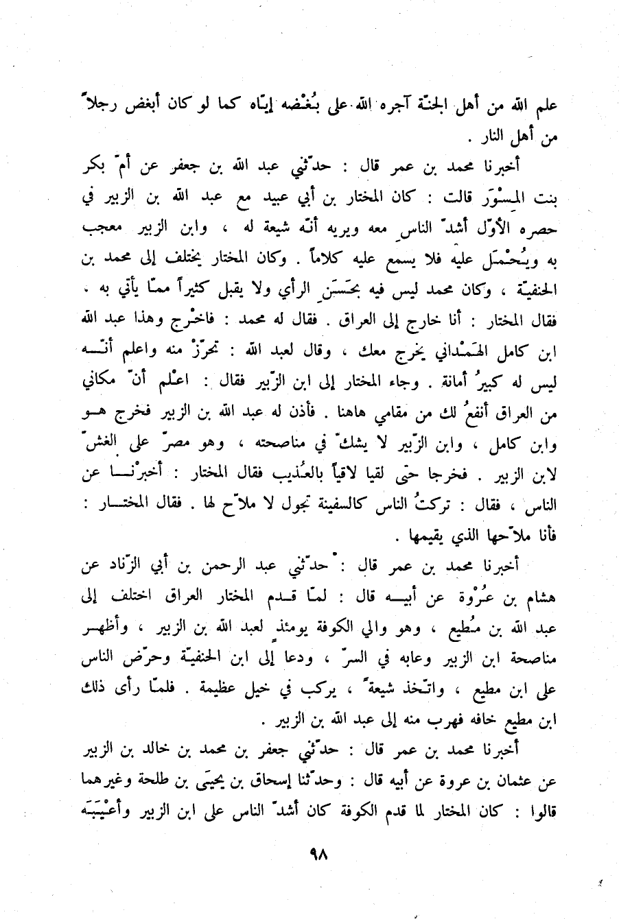 أَخْبَرَنَا مُحَمَّدُ بْنُ عُمَرَ قَالَ: حَدَّثَنِي عَبْدُ اللَّهِ بْنُ جَعْفَرٍ , عَنْ أُمِّ بَكْرٍ بِنْتِ الْمِسْوَرِ قَالَتْ: " كَانَ الْمُخْتَارُ بْنُ أَبِي عُبَيْدٍ مَعَ عَبْدِ اللَّهِ بْنِ الزُّبَيْرِ فِي حَصْرِهِ الْأَوَّلِ أَشَدَّ النَّاسِ مَعَهُ , وَيُرِيهِ أَنَّهُ شِيعَةٌ لَهُ وَابْنُ الزُّبَيْرِ مُعْجَبٌ بِهِ وَيَحْمِلُ عَلَيْهِ فَلَا يَسْمَعُ عَلَيْهِ كَلَامًا , وَكَانَ الْمُخْتَارُ يَخْتَلِفُ إِلَى مُحَمَّدِ ابْنِ الْحَنَفِيَّةِ , وَكَانَ مُحَمَّدٌ لَيْسَ فِيهِ بِحُسْنِ الرَّأْيِ , وَلَا يَقْبَلُ كَثِيرًا مِمَّا يَأْتِي بِهِ , فَقَالَ الْمُخْتَارُ: أَنَا خَارِجٌ إِلَى الْعِرَاقِ , فَقَالَ لَهُ مُحَمَّدٌ: فَاخْرُجْ , وَهَذَا عَبْدُ اللَّهِ بْنُ كَامِلٍ الْهَمْدَانِيُّ يَخْرُجُ مَعَكَ , وَقَالَ لِعَبْدِ اللَّهِ: تَحَرَّزْ مِنْهُ , وَاعْلَمْ أَنَّهُ لَيْسَ لَهُ كَبِيرُ أَمَانَةٍ , وَجَاءَ الْمُخْتَارُ إِلَى ابْنِ الزُّبَيْرِ , فَقَالَ: اعْلَمْ أَنَّ مَكَانِي مِنَ الْعِرَاقِ أَنْفَعُ لَكَ مِنْ مَقَامِي هَاهُنَا , فَأَذِنَ لَهُ عَبْدُ اللَّهِ بْنُ الزُّبَيْرِ , فَخَرَجَ هُوَ وَابْنُ كَامِلٍ وَابْنُ الزُّبَيْرِ لَا يَشُكُّ فِي مُنَاصَحَتِهِ وَهُوَ مُصِرٌّ عَلَى الْغِشِّ لِابْنِ الزُّبَيْرِ , فَخَرَجَا حَتَّى لَقِيَا لَاقِيًا بِالْعُذَيْبِ , فَقَالَ الْمُخْتَارُ: أَخْبِرْنَا عَنِ النَّاسِ , فَقَالَ: §تَرَكْتُ النَّاسَ كَالسَّفِينَةِ تَجُولُ لَا مَلَّاحَ لَهَا , فَقَالَ الْمُخْتَارُ: فَأَنَا مَلَّاحُهَا الَّذِي يُقِيمُهَا "