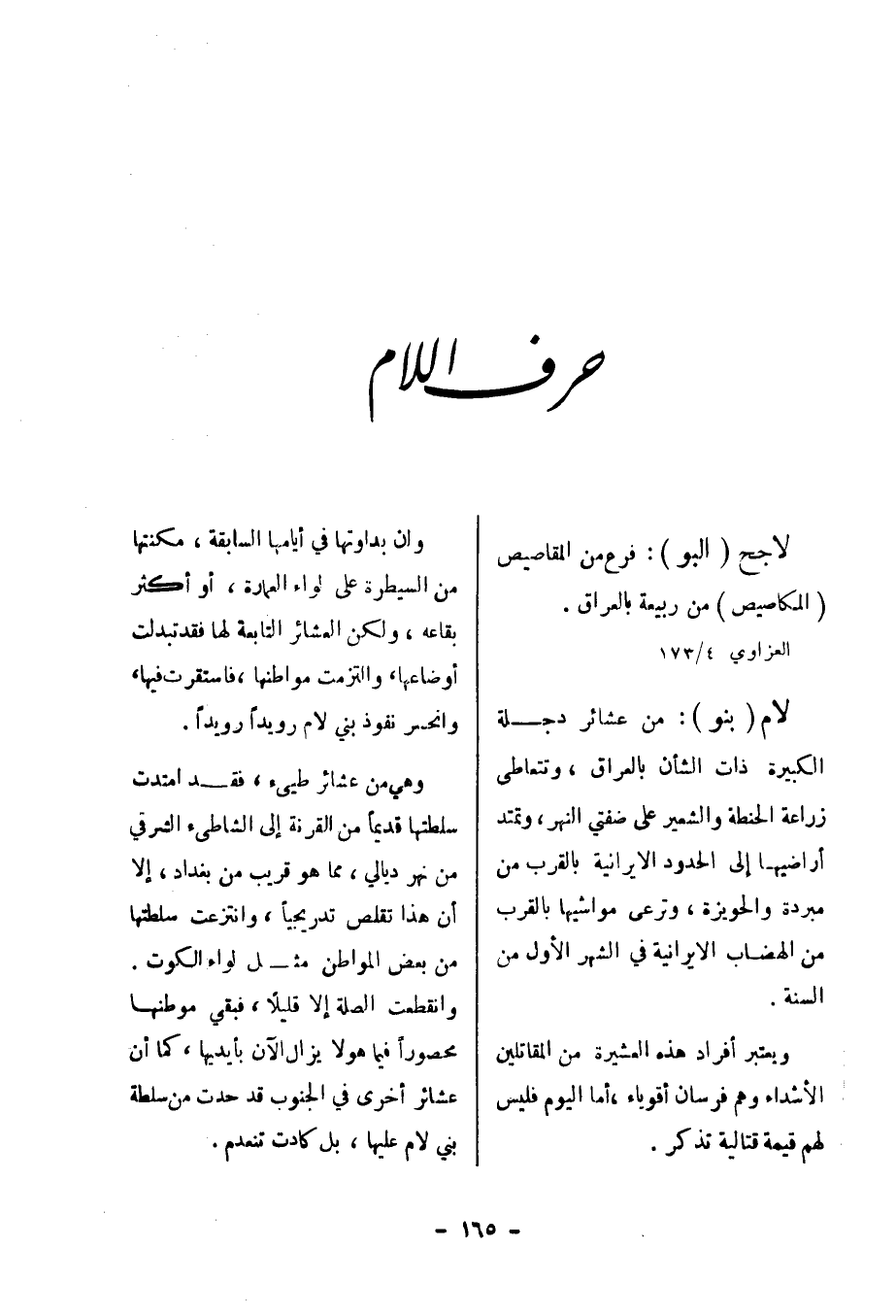 وانقطعت الصلة إلا قليلا، فبقي موطنها محصورا فيما هو لا يزال الآن بأيديها، كما أن عشائر أخرى في الجنوب قد حدت من سلطة بني لام عليها، بل كادت تنعدم.
