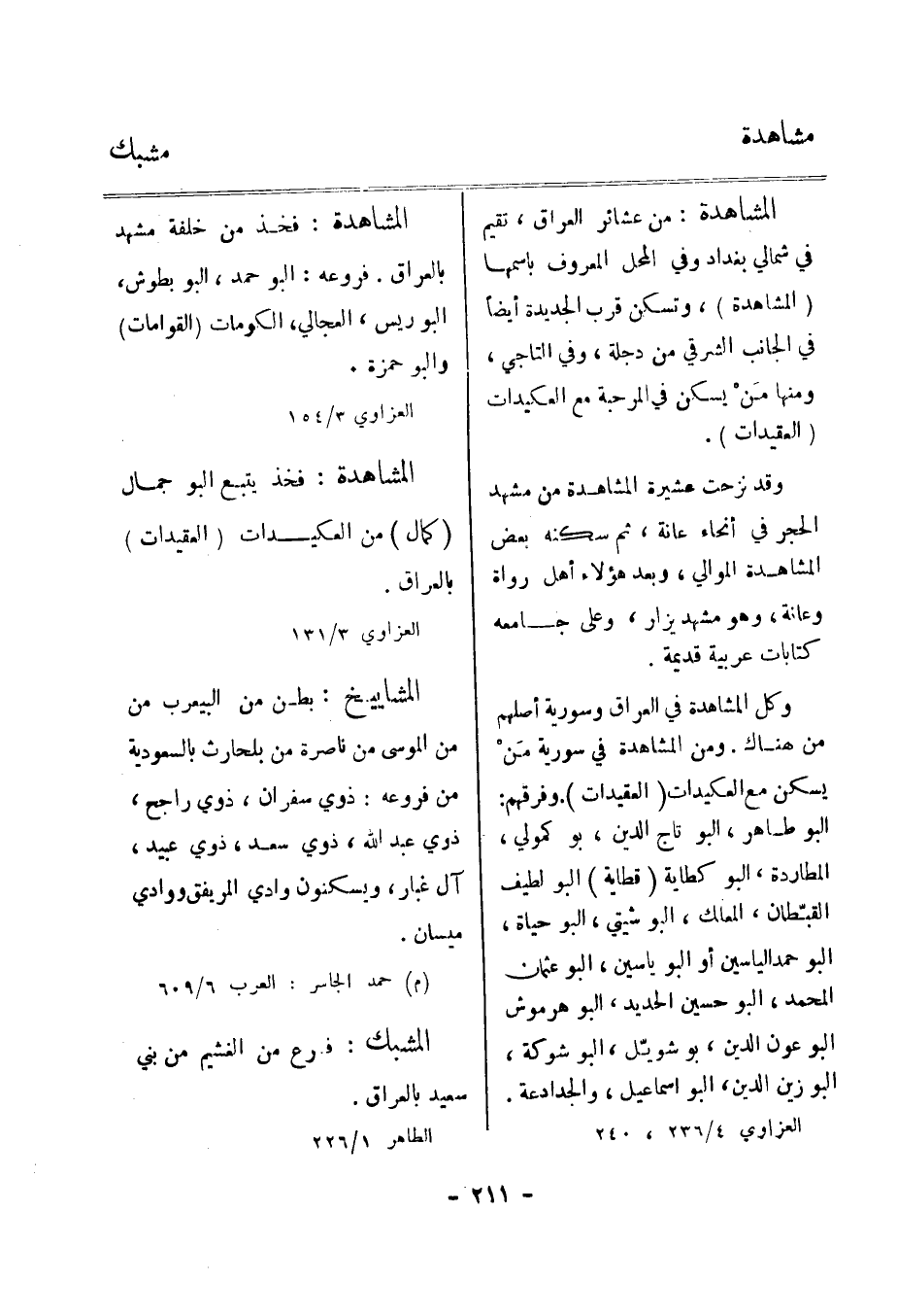 من عشائر العراق، تقيم في شمالي بغداد وفي المحل المعروف باسمها (المشاهدة) ، وتسكن قرب الجديدة أيضا في الجانب الشرقي من دجلة، وفي التاجي، ومنها من يسكن في المرحبة مع العكيدات (العقيدات) .