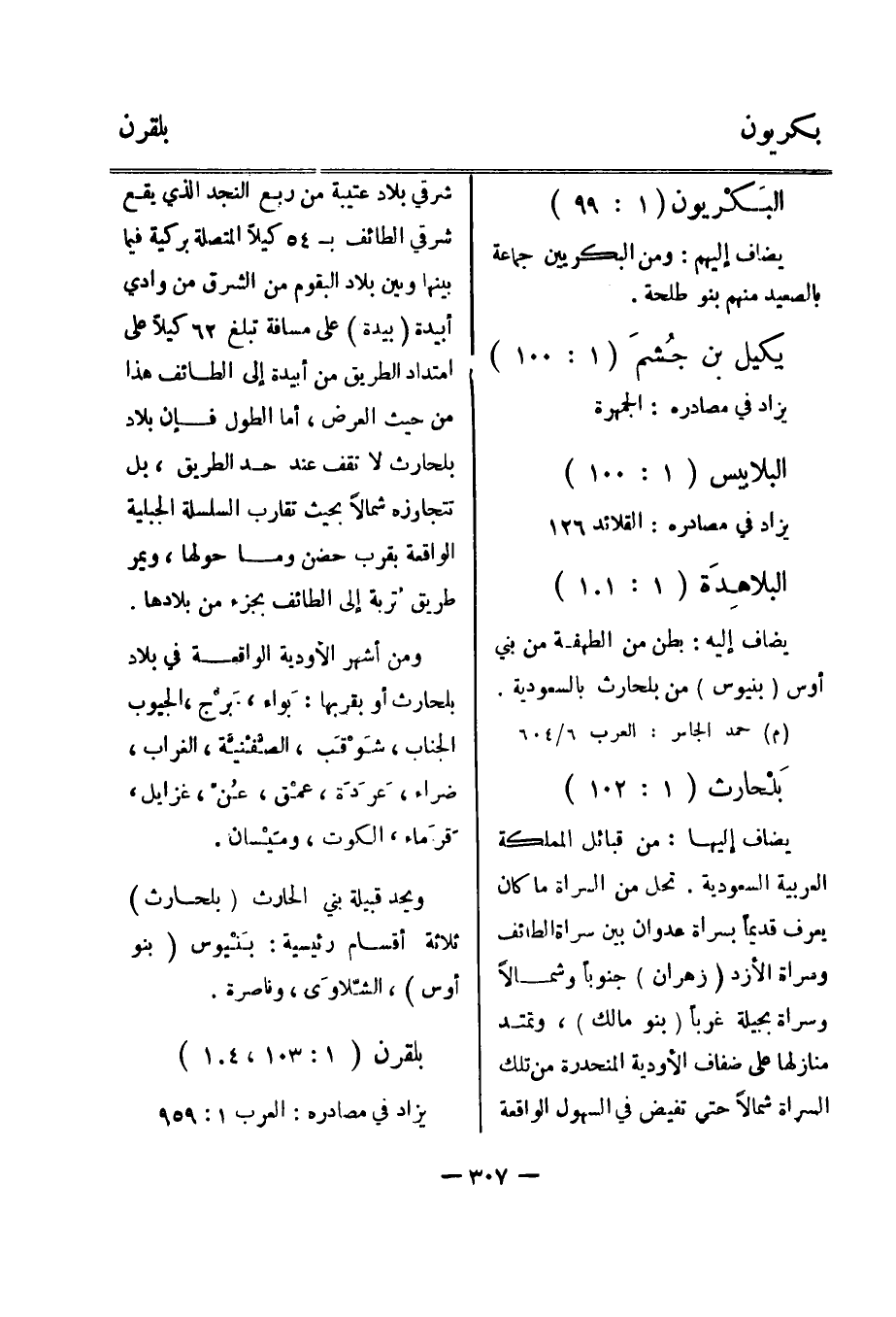 (1: 102) يضاف إليها: من قبائل المملكة العربية السعودية. تحل من السراة ما كان يعرف قديما بسراة عدوان بين سراة الطائف وسراة الأزد (زهران) جنوبا وشمالا وسراة بجيلة غربا (بنو مالك) ، وتمتد منازلها على ضفاف الأودية المنحدرة من تلك السراة شمالا حتى تفيض في السهول الواقعة شرقي بلاد عتيبة من ربع النجد الذي يقع شرقي الطائف ب 54 كيلا المتصلة بركية فيما بينها وبين بلاد البقوم من الشرق من وادي أبيدة (بيدة) على مسافة تبلغ 62 كيلا على امتداد الطريق من أبيدة إلى الطائف هذا من حيث العرض، أما الطول فإن بلاد بلحارث لا تقف عند حد الطريق، بل تتجاوزه شمالا بحيث تقارب السلسلة الجبلية الواقعة بقرب حضن وما حولها، ويمر طريق تربة إلى الطائف بجزء من بلادها.