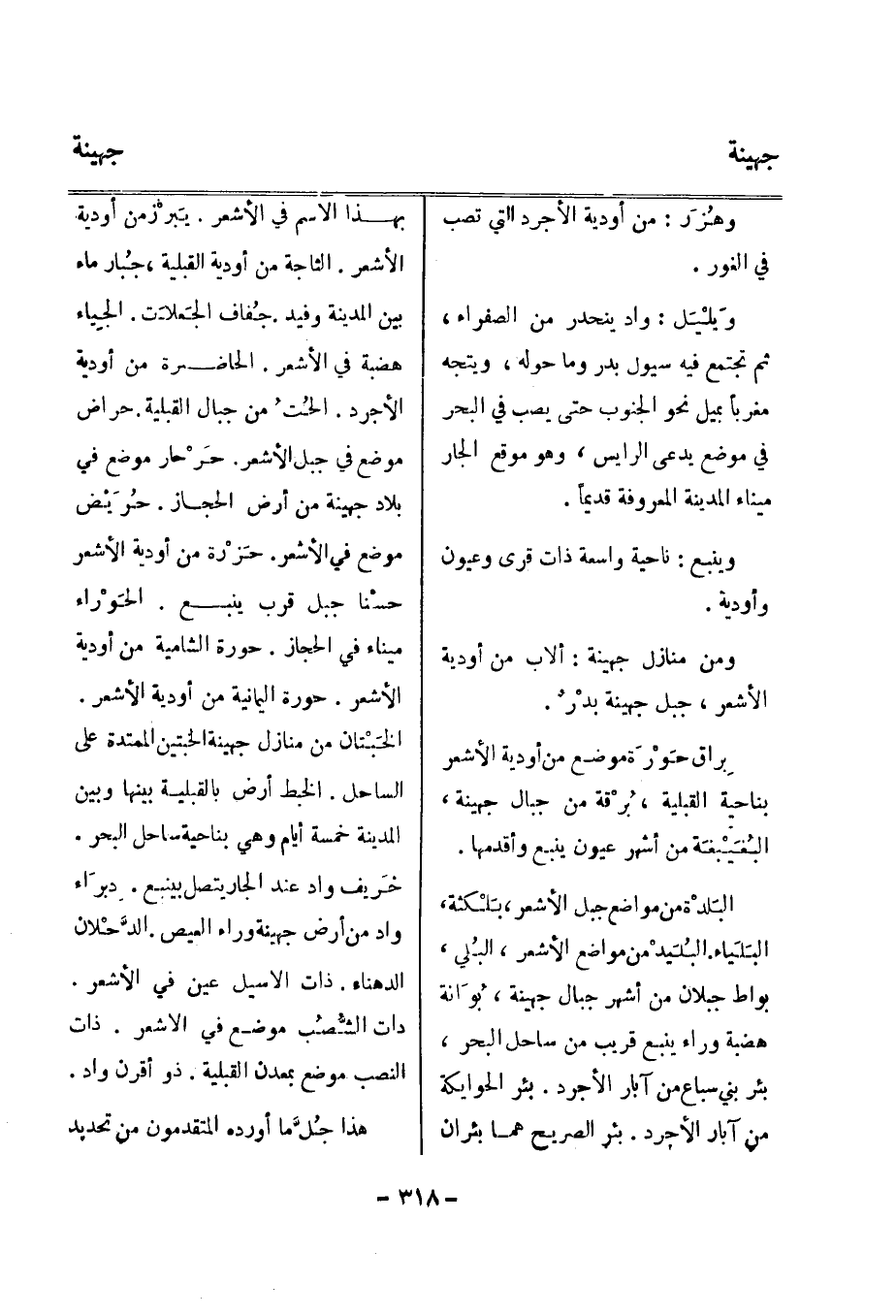 البلدة من مواضع جبل الأشعر، بلكثة، البلياء. البليد من مواضع الأشعر، البلي، بواط جبلان من أشهر جبال جهينة، بوانة هضبة وراء ينبع قريب من ساحل البحر، بئر بني سباع من آبار الأجرد. بئر الحوايكة من آبار الأجرد. بئر الصريح هما بئران بهذا الاسم في الأشعر. يبرز من أودية الأشعر. الثاجة من أودية القبلية، جبار ماء بين المدينة وفيد. جفاف الجعلات. الجياء هضبة في الأشعر. الحاضرة من أودية الأجرد. الحت من جبال القبلية. حراض موضع في جبل الأشعر. حرحار موضع في بلاد جهينة من أرض الحجاز. حريض موضع في الأشعر. حزرة من أودية الأشعر حسنا جبل قرب ينبع. الحوراء ميناء في الحجاز. حورة الشامية من أودية الأشعر. حورة اليمانية من أودية الأشعر الخبتان من منازل جهينة الخبتين الممتدة على الساحل. الخبط أرض بالقبلية بينها وبين المدينة خمسة أيام وهي بناحية ساحل البحر.