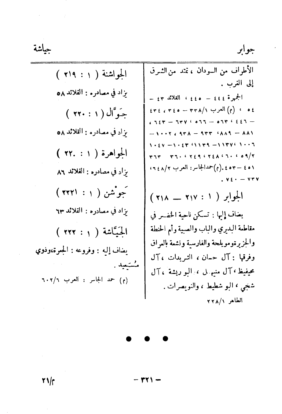 الجمهرة 444- 445، القلائد 43- 54، (م) العرب 1/ 338- 345، 434- 446، 563- 566، 637- 643، 881- 889، 933- 938، 1002- 1006، 1137- 1139، 1043- 1047 2/ 59، 60، 248، 249، 360- 363 451- 453. (م) حمد الجاسر: العرب 2/ 648، 737- 740.