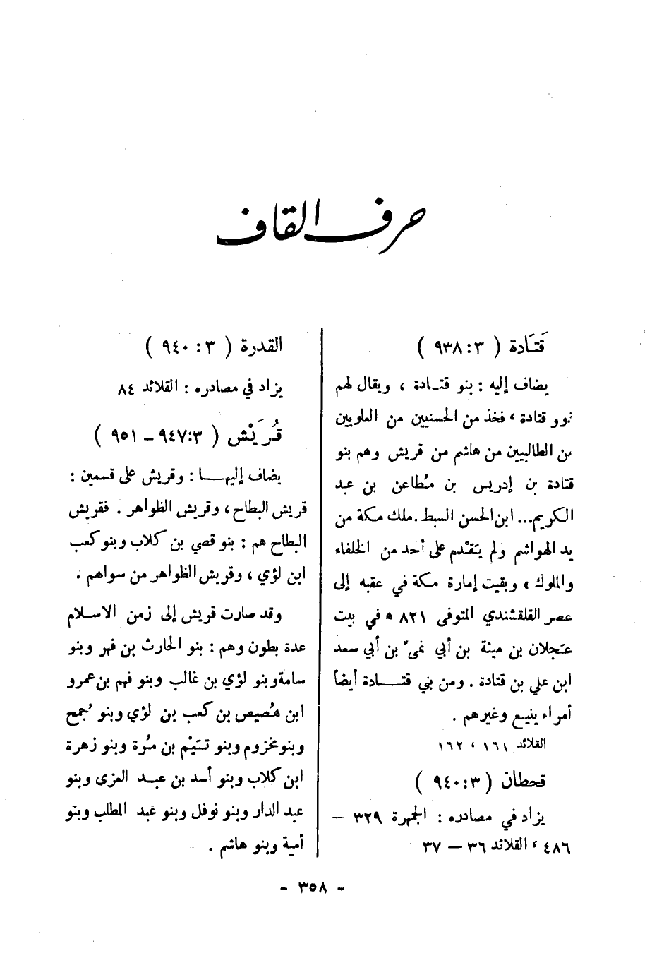 (3: 938) يضاف إليه: بنو قتادة، ويقال لهم نوو قتادة، فخذ من الحسنيين من العلويين من الطالبيين من هاشم من قريش وهم بنو قتادة بن إدريس بن مطاعن بن عبد الكريم ... ابن الحسن السبط. ملك مكة من يد الهواشم ولم يقدم على أحد من الخلفاء والملوك» وبقيت إمارة مكة في عقبه إلى عصر القلقشندي المتوفى 821 هـ في بيت عجلان بن ميثة بن أبي نمىّ بن أبي سعد ابن علي بن قتادة. ومن بني قتادة أيضا أمراء ينيع وغيرهم.
