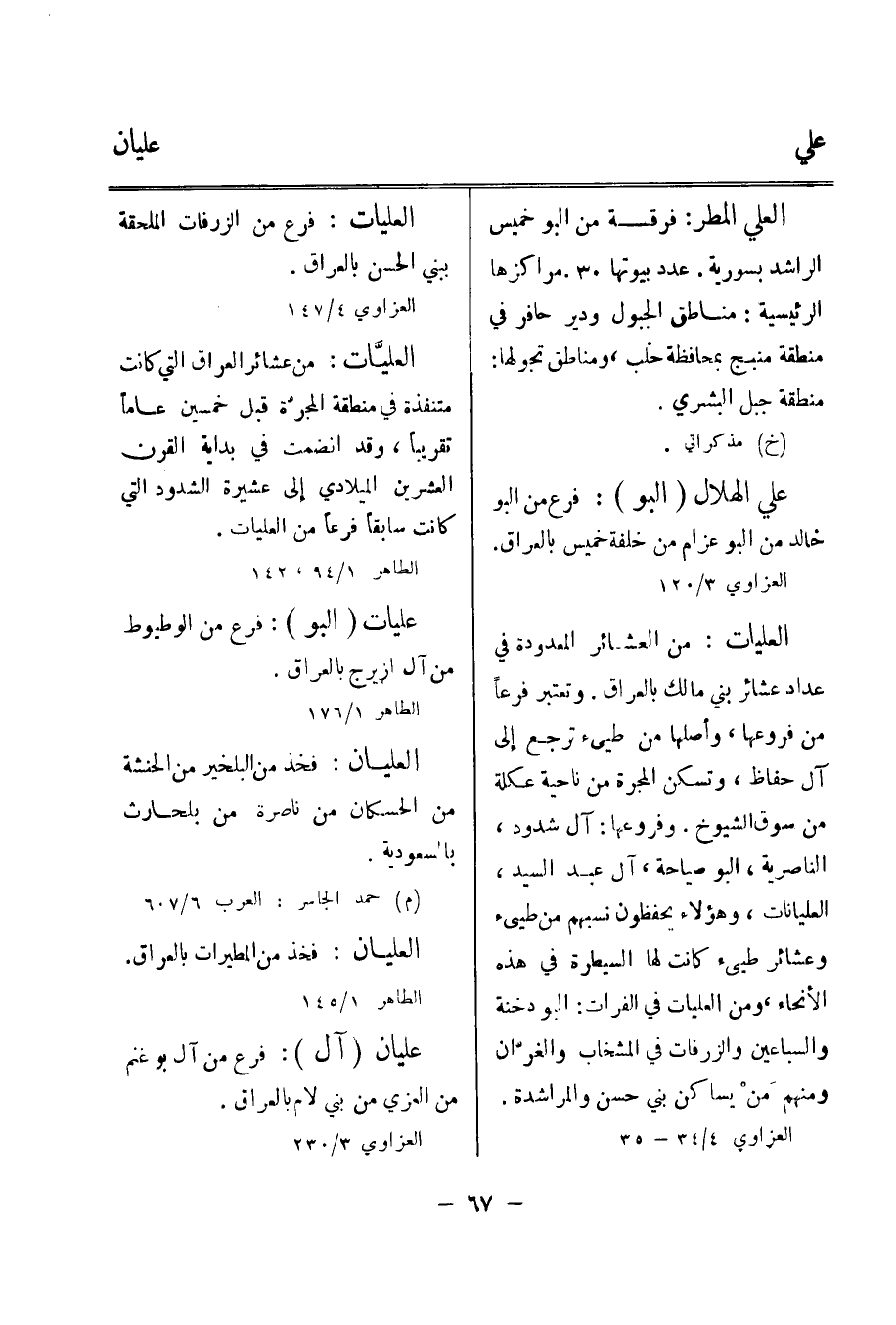 من العشائر المعدودة في عداد عشائر بني مالك بالعراق. وتعتبر فرعا من فروعها، وأصلها من طيء ترجع إلى آل حفاظ، وتسكن المجرة من ناحية عكلة من سوق الشيوخ. وفروعها: آل شدود، الناصرية، البو صياحة، آل عبد السيد، العليانات، وهؤلاء يحفظون نسبهم من طيء وعشائر طيء كانت لها السيطرة في هذه الأنحاء، ومن العليات في الفرات: البو دخنة والسباعين والزرفات في المشخاب والغرّان ومنهم من يساكن بني حسن والمراشدة.
