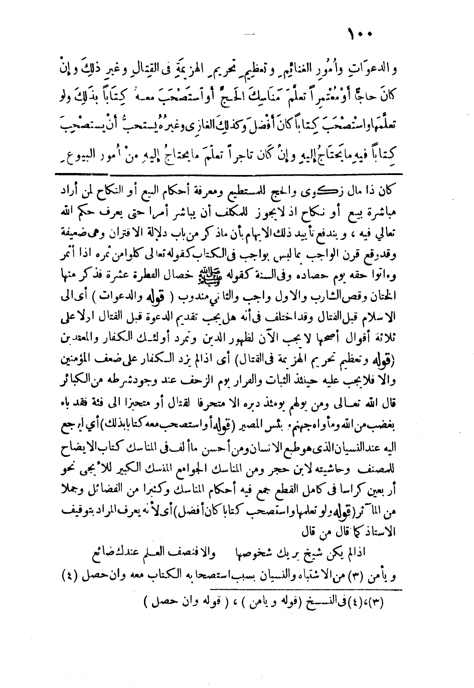 كان ذا مال زكوي والحج للمستطيع ومعرفة أحكام البيع أو النكاح لمن اراد مباشرة بيع أو نكاح إذ لا يجوز للمكلف أن يباشر أمرًا حتى يعرف حكم الله تعالى فيه، ويندفع تأييد ذلك الإيهام بأن ما ذكر من باب دلالة الاقتران وهي ضعيفة وقد وقع قرن الواجب بما ليس بواجب في الكتاب كقوله تعالى: {كُلُوا مِنْ ثَمَرِهِ إِذَا أَثْمَرَ وَآتُوا حَقَّهُ يَوْمَ حَصَادِهِ} وفي السنة كقوله - صلى الله عليه وسلم -: "خصال الفطرة عشرة فذكر منها الختان وقص الشارب والأول واجب والثاني مندوب قوله: (والدعوات) أي إلى الإسلام قبل القتال وقد اختلف في أنه هل يجب تقديم الدعوة قبل القتال أو لا على ثلاثة أقوال أصحها لا يجب الآن لظهور الدين وتمرد أولئك الكفار والمعتدين. قوله: (وتعظيم تحريم الهزيمة في القتال) أي إذا لم يزد الكفار على ضعف المؤمنين وإلا فلا يجب عليه حينئذٍ الثبات والفرار يوم الزحف عند وجود شرطه من الكبائر قال الله تعالى: {وَمَنْ يُوَلِّهِمْ يَوْمَئِذٍ دُبُرَهُ إلا مُتَحَرِّفًا لِقِتَالٍ أَوْ مُتَحَيِّزًا إِلَى فِئَةٍ فَقَدْ بَاءَ بِغَضَبٍ مِنَ اللَّهِ وَمَأْوَاهُ جَهَنَّمُ وَبِئْسَ الْمَصِيرُ} قوله: (أو استصحب معه كتابًا بذلك) أي ليرجع إليه عند النسيان الذي هو طبع الإنسان ومن أحسن ما ألف في المناسك كتاب الإيضاح للمصنف وحاشيته لابن حجر ومن المناسك الجوامع المنسك الكبير للأيجي نحو أربعين كراسًا في كامل القطع جمع فيه أحكام المناسك وكثيرًا من الفضائل وجملًا من المآثر. قوله: (ولو تعلمها واستصحب كتابًا كان أفضل) أي لأنه يعرف المراد بتوقيف الأستاذ كما قال من قال: