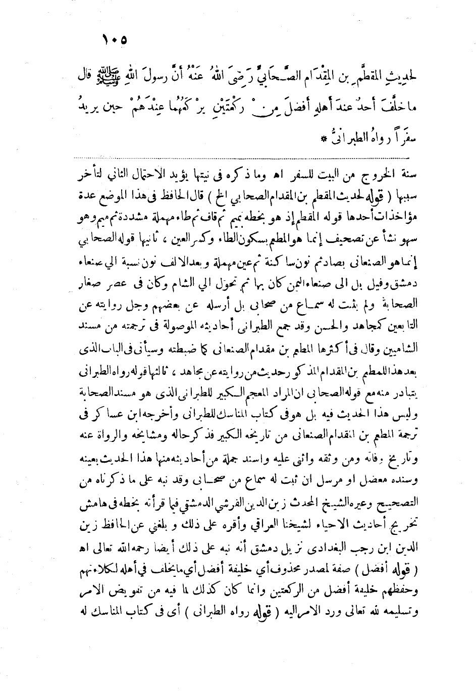 سنة الخروج من البيت للسفر اهـ. وما ذكره في نيتها يؤيد الاحتمال الثاني لتأخر سببها. قوله: (لحديث المقطم بن المقدام الصحابي الخ) قال الحافظ في هذا الموضع عدة مؤاخذات أحدها قوله المقطم إذ هو بخطه بميم ثم قاف ثم طاء مهملة مشددة ثم ميم وهو سهو نشأ عن تصحيف إنما هو المطعم بسكون الطاء وكسر العين، ثانيها قوله الصحابي إنما هو الصنعاني بصاد ثم نون ساكنة ثم عين مهملة وبعد الألف نون نسبة إلى صنعاء دمشق وقيل بل إلى صنعاء اليمن كان بها ثم تحول إلى الشام وكان في عصر صغار الصحابة ولم يثبت له سماع من صحابي بل أرسله عن بعضهم وجل روايته عن التابعين كمجاهد والحسن وقد جمع الطبراني أحاديثه الموصولة في ترجمته من مسند الشاميين وقال في أكثرها المطعم بن مقدام الصنعاني كما ضبطته وسيأتي في الباب الذي بعد هذا للمطعم بن المقدام المذكور حديث من روايته عن مجاهد، ثالثها قوله رواه الطبراني يتبادر منه مع قوله الصحابي إن المراد المعجم الكبير للطبراني الذي هو مسند الصحابة وليس هذا الحديث فيه بل هو في كتاب المناسك للطبراني وأخرجه ابن عساكر في ترجمة المطعم بن المقدام الصنعاني من تاريخه الكبير فذكر حاله ومثايخه والرواة عنه وتاريخ وفاته ومن وثقه وأثنى عليه وأسند جملة من أحاديثه منها هذا الحديث بعينه وسنده معضل أو مرسل إن ثبت له سماع من صحابي وقد نبه على ما ذكرناه من التصحيح وعيره الشيخ المحدث زين الدين القرشي الدمشقي فيما قرأته بخطه في هامش تخريج أحاديث الأحياء لشيخنا العراقي وأقره على ذلك وبلغني عن الحافظ زين الدين بن رجب البغدادي نزيل دمشق أنه نبه على ذلك أيضًا رحمه الله تعالى اهـ. قوله: (أفضل) صفة لمصدر محذوف أي خليفة أفضل أي ما يخلف في أهله لكلاءتهم وحفظهم خليفة أفضل من الركعتين وإنما كان كذلك لما فيه من تفويض الأمر وتسليمه الله تعالى ورد الأمر إليه. قوله: (رواه الطبراني) أي في كتاب المناسك له