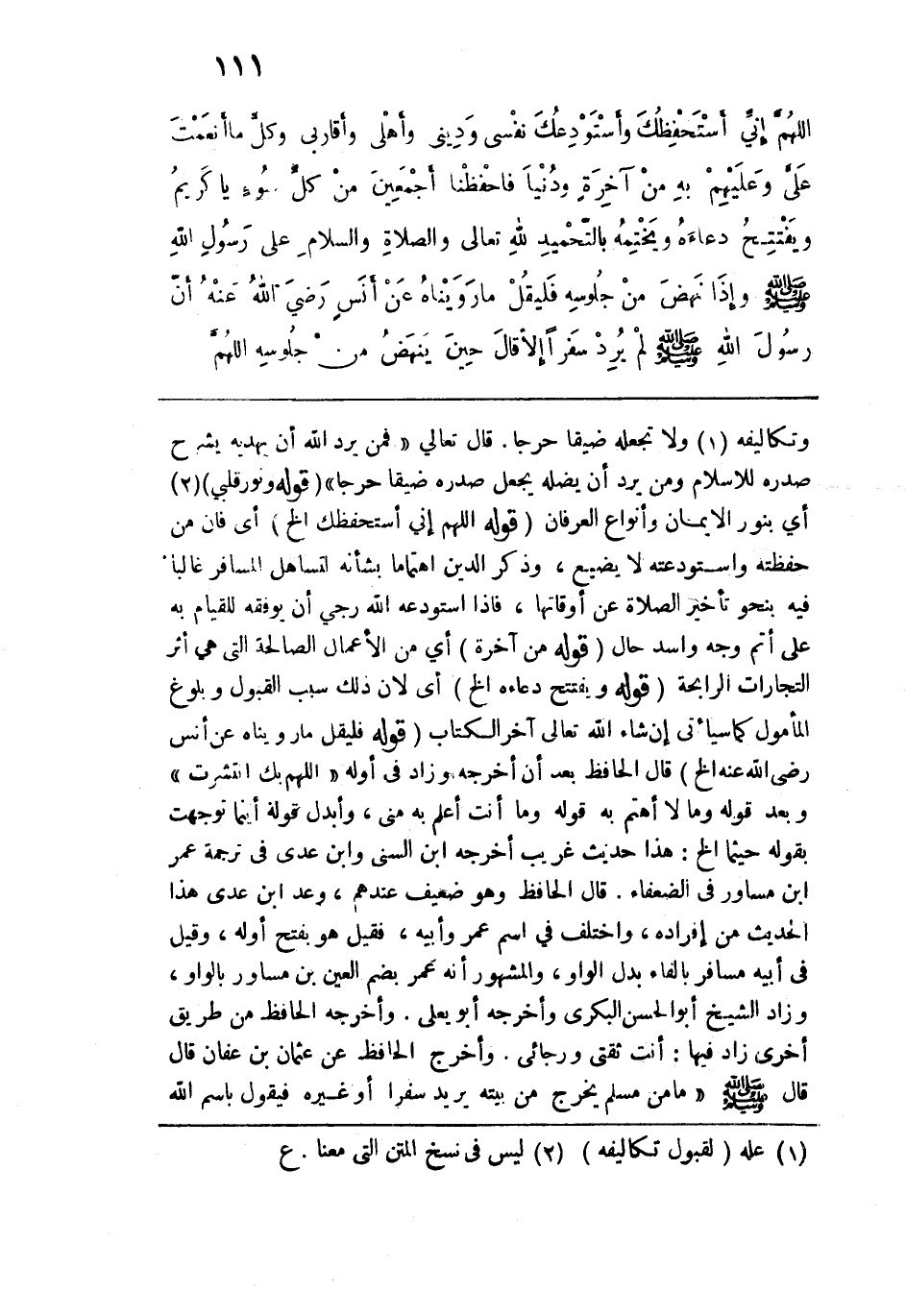 وتكاليفه ولا تجعله ضيقًا حرجًا. قال تعالى: {فمن يُرِدِ اللَّهُ أَنْ يَهْدِيَهُ يَشْرَحْ صَدْرَهُ لِلْإِسْلَامِ وَمَنْ يُرِدْ أَنْ يُضِلَّهُ يَجْعَلْ صَدْرَهُ ضَيِّقًا حَرَجًا}. قوله: (ونور قلبي) أي بنور الإيمان وأنواع العرفان. قوله: (اللهم إني أستحفظك الخ) أي فإن من حفظته واستودعته لا يضيع، وذكر الدين اهتمامًا بشأنه لتساهل المسافر غالبًا فيه بنحو تأخير الصلاة عن أوقاتها، فإذا استودعه الله رجي أن يوفقه للقيام به على أتم وجه وأسد حال. قوله: (من آخرة) أي من الأعمال الصالحة التي هي أثر التجارات الرابحة. قوله: (ويفتتح دعاءه الخ) أي لأن ذلك سبب القبول وبلوغ المأمول كما سيأتي إن شاء الله تعالى آخر الكتاب. قوله: (فليقل ما رويناه عن أنس رضي الله عنه الخ) قال الحافظ بعد أن أخرجه وزاد في أوله "اللهم بك انتشرت" وبعد قوله وما لا أهتم به قوله وما أنت أعلم به مني، وأبدل قوله أينما توجهت بقوله حيثما الخ: هذا حديث غريب أخرجه ابن السني وابن عدي في ترجمة عمر بن مساور في الضعفاء. قال الحافظ وهو ضعيف عندهم، وعد ابن عدي هذا الحديث من إفراده واختلف في اسم عمر وأبيه، فقيل هو بفتح أوله، وقيل في أبيه مسافر بالفاء بدل الواو، والمشهور أنه عمر بضم العين ابن مساور بالواو، وزاد الشيخ أبو الحسن البكري وأخرجه أبو يعلى. وأخرجه الحافظ من طريق أخرى زاد فيها: أنت ثقتي ورجائي. وأخرج الحافظ عن عثمان بن عفان قال: قال - صلى الله عليه وسلم -: "ما من مسلم يخرج من بيته يريد سفرًا أو غيره فيقول بسم الله