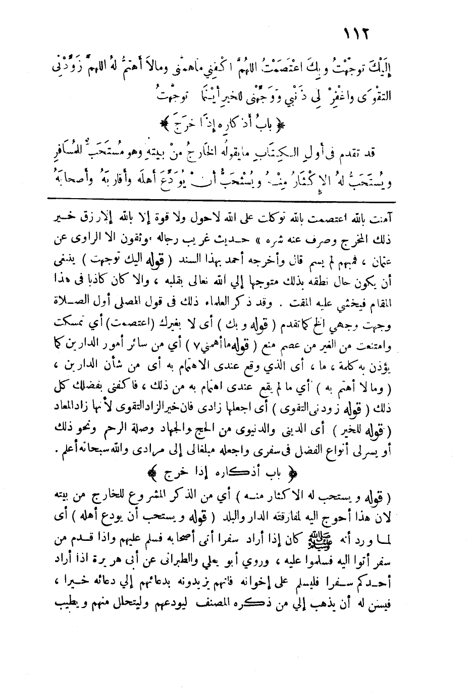 آمنت بالله اعتصمت بالله توكلت على الله لا حول ولا قوة إلا بالله إلا رزق خير ذلك المخرج وصرف عنه شره" حديث غريب رجاله موثقون إلا الراوي عن عثمان، فمبهم لم بسم قال: وأخرجه أحمد بهذا السند. قوله: (إليك توجهت) ينبغي أن يكون حال نطقه بذلك متوجهًا إلى الله تعالى بقلبه، وإلا كان كاذبًا في هذا المقام فيخشى عليه المقت. وقد ذكر العلماء ذلك في قول المصلى أول الصلاة وجهت وجهي الخ كما تقدم. قوله: (وبك) أي لا بغيرك (اعتصمت) أي تمسكت وامتنعت من الغير من عصم منع. قوله: (ما أهمني) أي من سائر أمور الدارين كما يؤذن به كلمة، ما، أي الذي وقع عندي الاهتمام به أي من شأن الدارين، (وما لا أهتم به) أي ما لم يقع عندي اهتمام به من ذلك، فاكفني بفضلك كل ذلك قوله: (زودني التقوى) أي اجعلها زادي فإن خير الزاد التقوى لأنها زاد المعاد. قوله: (للخير) أي الديني والدنيوي من الحج والجهاد وصلة الرحم ونحو ذلك أو يسر لي أنواع الفضل في سفري واجعله مبلغًا لي إلى مرادي والله سبحانه أعلم.