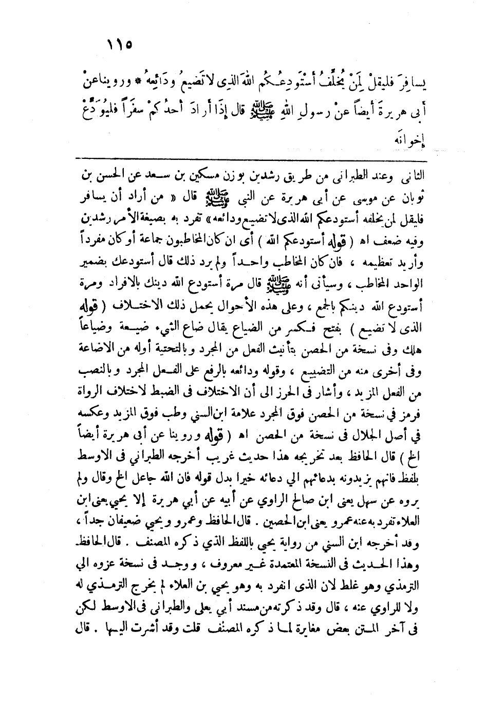 وروينا عن أبي هريرة أيضًا عن رسول الله - صلى الله عليه وسلم - قال: "إذا أرَادَ أحَدُكُمْ سَفرًا فَلْيُوَدِّع إخوانَهُ،
