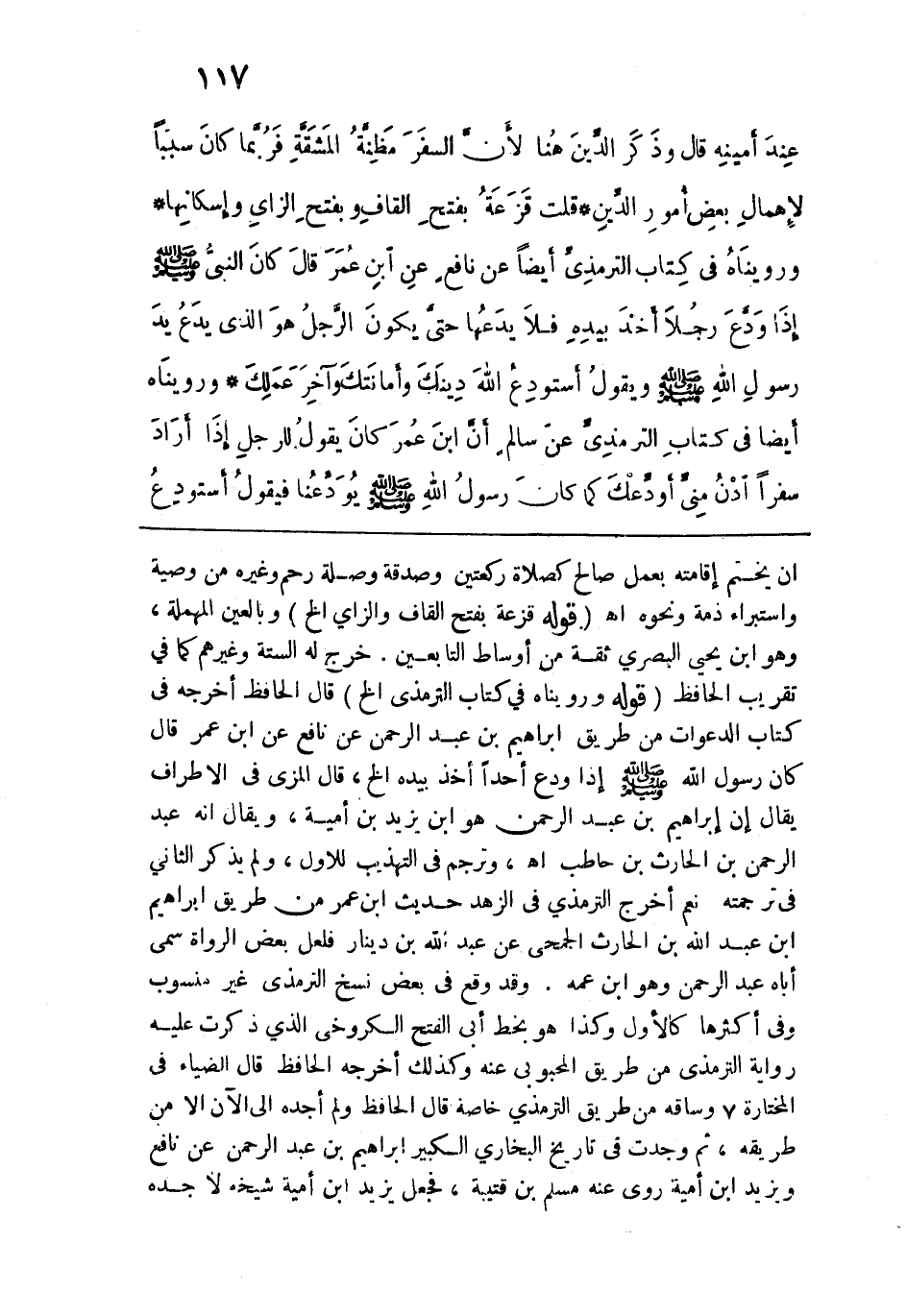 ورويناه في كتاب الترمذي أيضًا عن نافع عن ابن عمر قال: "كان النبي - صلى الله عليه وسلم - إذا ودع رجلًا أخذ بيده فلا يدَعها حتى يكونَ الرجل هو الذي يدع يد رسول الله - صلى الله عليه وسلم -، ويقول: أسْتَودعُ اللهَ دِينَكَ وأمانَتَكَ وآخِرَ عَمَلِكَ".