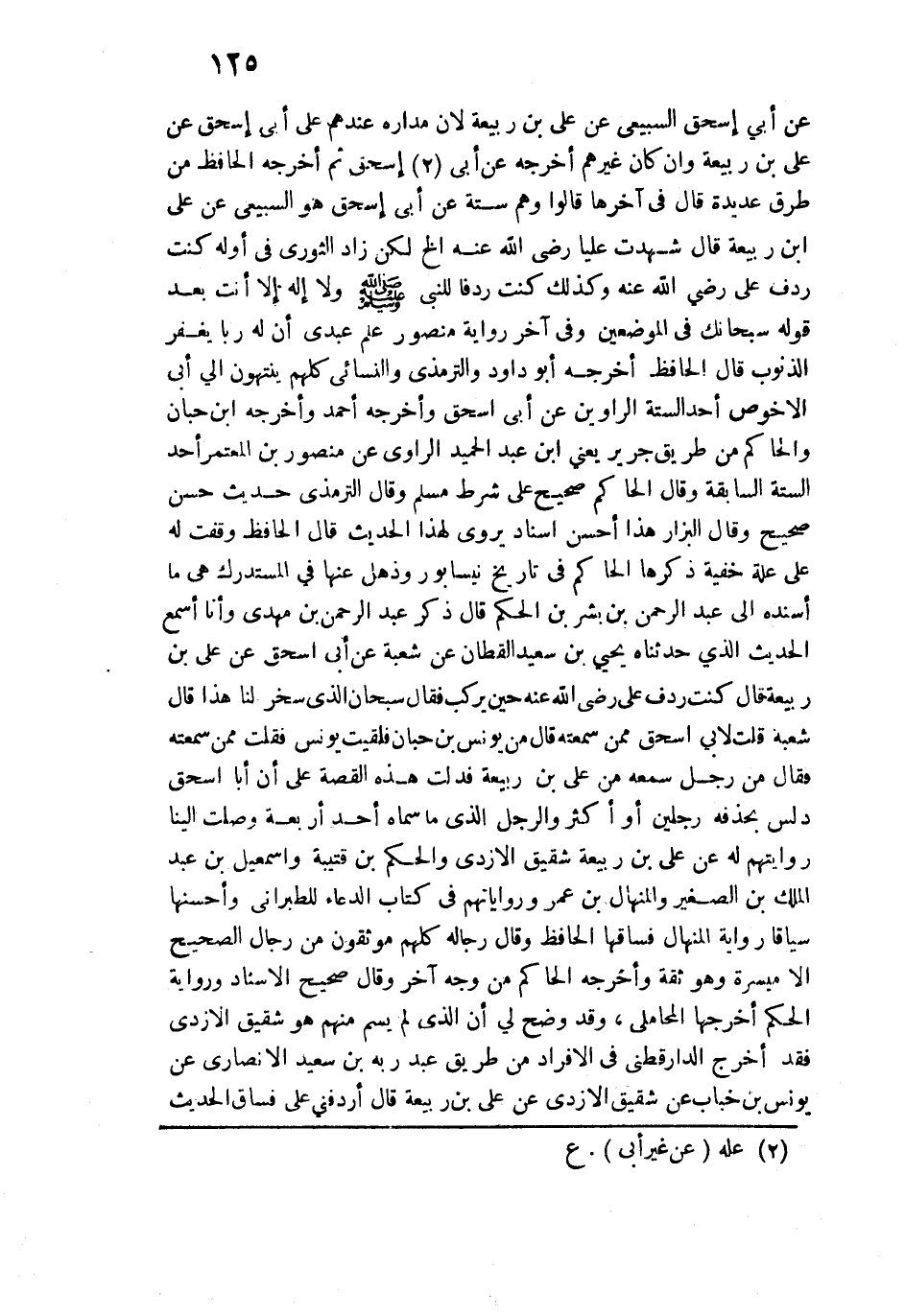 أبي إسحاق عن علي بن ربيعة قال كنت ردف علي رضي الله عنه حين يركب فقال: {سُبْحَانَ الَّذِي سَخَّرَ لَنَا هَذَا} قال شعبة قلت لأبي إسحاق ممن سمعته قال من يونس بن حبان فلقيت يونس فقلت ممن سمعته فقال من رجل سمعه من علي بن ربيعة فدلت هذه القصة على أن ابا إسحاق دلس بحذفه رجلين أو أكثر والرجل الذي ما سماه أحد أربعة وصلت إلينا روايتهم له عن علي بن ربيعة شقيق الأزدي والحكم بن قتيبة وإسماعيل بن عبد الملك بن الصغير والمنهال بن عمر ورواياتهم في كتاب الدعاء للطبراني وأحسنها سياقًا رواية المنهال فساقها الحافظ وقال رجاله كلهم موثقون من رجال الصحيح إلا ميسرة وهو ثقة وأخرجه الحاكم من وجه آخر وقال صحيح الإسناد ورواية الحكم أخرجها المحاملي، وقد وضح لي أن الذي لم بسم منهم هو شقيق الأزدي فقد أخرج الدارقطني في الأفراد من طريق عبد ربه ابن سعيد الأنصاري عن يونس بن خباب عن شقيق الأزدي عن علي بن ربيعة قال: أردفني على فساق الحديث