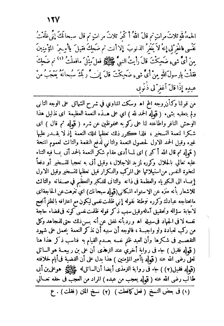 الحَمدُ لِلهِ، ثلاث مرات، ثم قال: اللهُ أكْبرُ، ثلاث مرات، ثم قال: سُبْحانكَ إني ظَلَمْتُ نَفْسِي فاغْفِرْ لي، إنَّهُ لا يَغْفِرُ الذُّنُوبَ إلا أنْتَ، ثم ضحك، فقيل: يا أمير المؤمنين من أي شيء ضحكت؟ قال: رأيت النبي - صلى الله عليه وسلم - فعل مثل ما فعلت ثم ضحك، فقلت: يا رسول الله من أي شيء ضحكت؟ قال: "إن رَبَّكَ سُبْحانَهُ يَعْجَبُ مِنْ عَبْدِهِ إذا قال: اغْفِرْ لي ذُنُوبي،