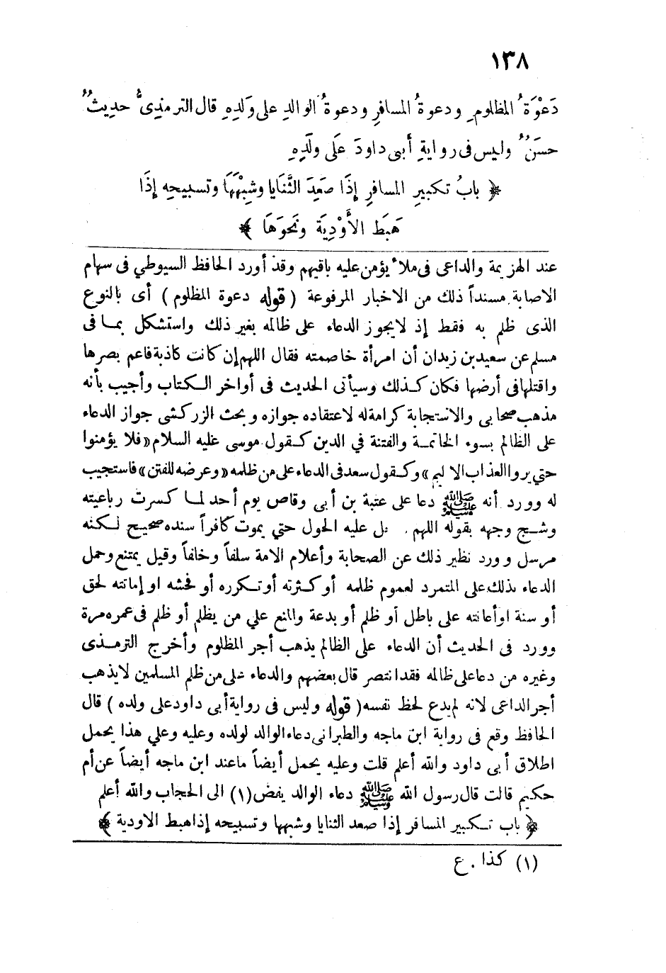 امرأة خاصمته فقال: اللهم إن كانت كاذبة فاعم بصرها واقتلها في أرضها فكان كذلك وسيأتي الحديث في أواخر الكتاب وأجيب بأنه مذهب صحابي والاستجابة كرامة له لاعتقاده جوازه وبحث الزركشي جواز الدعاء على الظالم بسوء الخاتمة والفتنة في الدين كقول موسى - عليه السلام -: "فلا يؤمنوا حتى يروا العذاب الأليم" وكقول سعد في الدعاء على من ظلمه "وعرضه للفتن" فأستجيب له وورد أنه - صلى الله عليه وسلم - دعا على عتبة بن أبي وقاص يوم أحد لما كسرت رباعيته وشج وجهه بقوله اللهم لا تحل عليه الحول حتى يموت كافرًا سنده صحيح لكنه مرسل وورد نظير ذلك عن الصحابة وأعلام الأمة سلفًا وخلفًا وقيل يمتنع وحمل الدعاء بذلك على المتمرد لعموم ظلمه أو كثرته أو تكرره أو فحشه أو إماتته لحق أو سنة أو إعانته على باطل أو ظلم أر بدعة والمنع على من يظلم أو ظلم في عمره مرة وورد في الحديث أن الدعاء على الظالم يذهب أجر المظلوم وأخرج الترمذي وغيره من دعا على ظالمه فقد انتصر قال بعضهم والدعاء على من ظلم المسلمين لا يذهب أجر الداعي لأنه لم يدع لحظ نفسه. قوله: (وليس في رواية أبي داود على ولده) قال الحافظ في رواية ابن ماجه والطبراني دعاء الوالد لولده وعليه وعلى هذا يحمل إطلاق أبي داود والله أعلم قلت وعليه يحمل أيضًا ما عند ابن ماجه أيضًا عن أم حكيم قالت: قال رسول الله - صلى الله عليه وسلم - دعاء الوالد يفض إلى الحجاب والله أعلم.