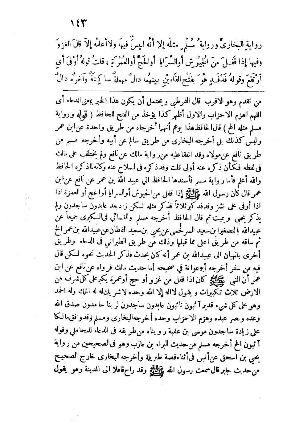 من تقدم وهو الأقرب قال القرطبي ويحتمل أن يكون هذا الخبر بمعنى الدعاء أي اللهم اهزم الأحزاب والأول أظهر كذا يؤخذ من الفتح للحافظ. قوله: (ورواية مسلم مثله الخ) قال الحافظ هذا يوهم أنهما أخرجاه من طريق واحدة عن ابن عمر وليس كذلك بل أخرجه البخاري من طريق سالم عن أبيه وأخرجه مسلم من طريق نافع عن مولاه وقد اتفقا عليه من رواية مالك عن نافع ولم يختلف على مالك في لفظه فكأن ذكره عنه أولى قلت وفي ذكره في السلاح عنه وكأنه لما ذكره الحافظ والله أعلم فأما رواية مسلم فأسندها الحافظ إلى عبيد الله بن عمر عن نافع عن ابن عمر قال: كان رسول الله - صلى الله عليه وسلم - إذا قفل من الجيوش أو السرايا أو الحج أو العمرة إذا أوفى على نشز وفدفد كبر ثلاثًا فذكر مثله لكن زاد بعد عابدون ساجدون ولم يذكر يحيي ويميت ثم قال الحافظ أخرجه مسلم والنسائي في الكبرى جميعًا عن عبيد الله بالتصغير ابن سعيد السرخسي عن يحيى بن سعيد القطان عن عبيد الله بن عمر الخ ثم ساقه من طريق أعلى مما قبلها وذلك من طريق الطبراني في الدعاء وطريق أخرى ينتهيان إلى عبيد الله بن عمر أنه كان يحدث فذكر الحديث نحوه لكن قال فيه من سفر أخرجه أبو عوانة في صحيحه أما حديث مالك فرواه عن نافع عن ابن عمر أن النبي - صلى الله عليه وسلم - كان إذا قفل من غزو أو حج أو عمرة يكبر على كل شرف من الأرض ثلاث تكبيرات ويقول: لا إله إلا الله وحده لا شريك له له الملك وله الحمد وهو على كل شيء قدير آئبون تائبون عابدون ساجدون لربنا حامدون صدق الله وعده ونصر عبده وهزم الأحزاب وحده أخرجه البخاري ومسلم وقد وافق مالكًا على زيادة ساجدون موسى بن عقبة رويناه من طريقه في الدعاء للمحاملي وقوله آئبون الخ أخرجه مسلم من حديث البراء بن عازب وهو في الصحيحين من رواية يحيى بن إسحاق عن أنس في أثناء قصة طويلة وأخرجه البخاري خارج الصحيح من حديث جابر قال: سمعت رسول الله - صلى الله عليه وسلم - وقد راح قافلا إلى المدينة وهو يقول: