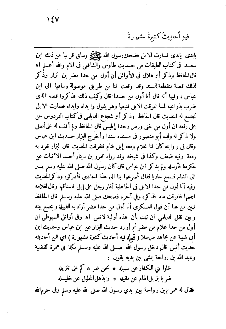 فضحك - صلى الله عليه وسلم - قال الحافظ: تبين من هنا أن قول العسكري: أنا أول من حدا مضر أراد به القبيلة ويجمع بينه وبين نقل الديلمي إن ثبت بأن هذه أولية لأنس اهـ. وفي أوائل السيوطي أن أول من حدا غلام من مضر ثم أورد حديث البزار عن ابن عباس وحديث ابن أبي شيبة عن مجاهد مرسلًا. قوله: (فيه أحاديث كثيرة مشهورة) أي فمن أحاديثه حديث أنس قال: دخل رسول الله - صلى الله عليه وسلم - مكة في عمرة القضية وعبد الله بن رواحة يمشي بين يديه يقول: