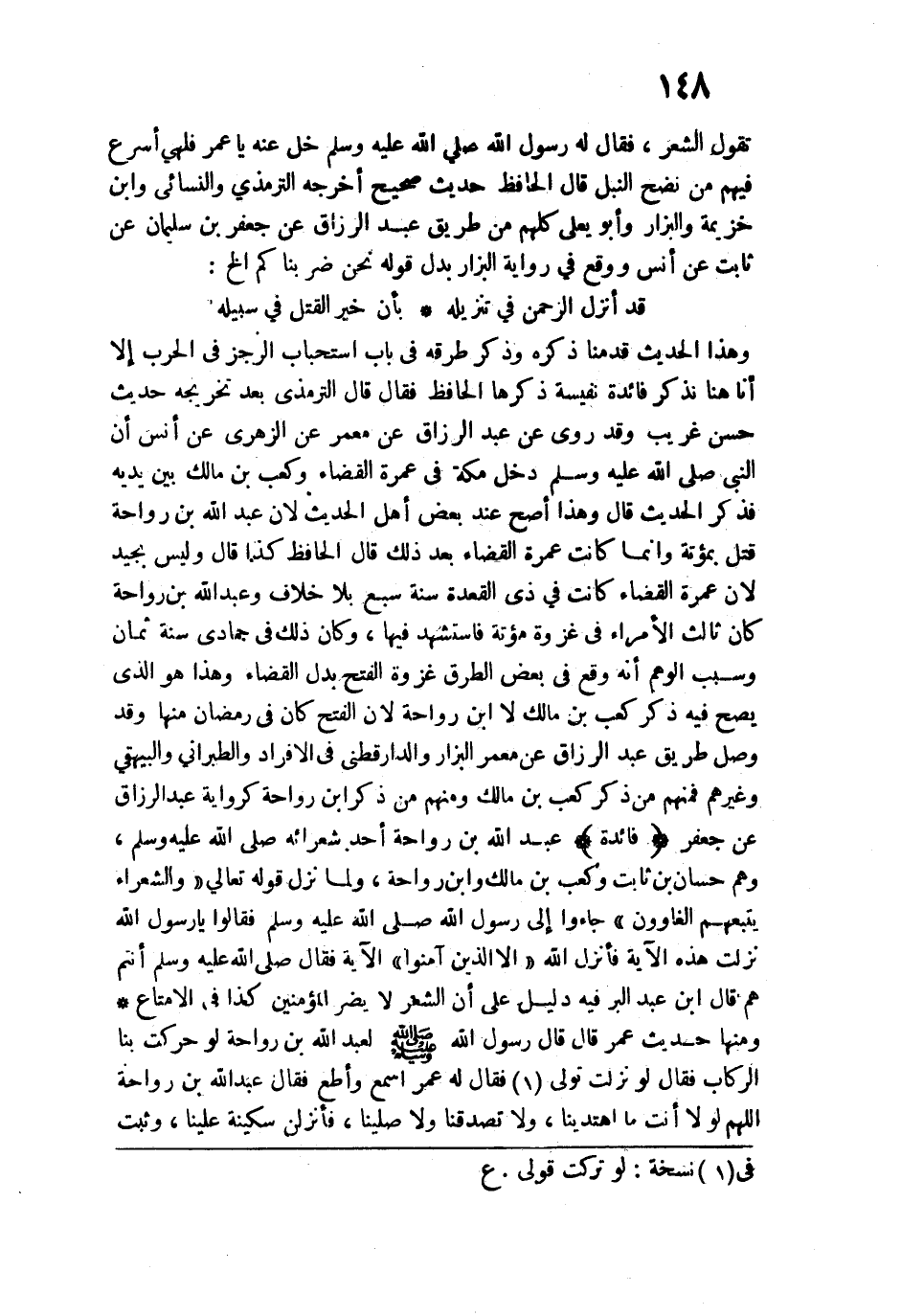 ومنها حديث عمر قال: قال رسول الله - صلى الله عليه وسلم - لعبد الله بن رواحة لو حركت بنا الركاب فقال: لو نزلت تولى فقال له عمر: اسمع وأطع فقال عبد الله بن رواحة: اللهم لولا أنت ما اهتدينا ولا تصدقنا ولا