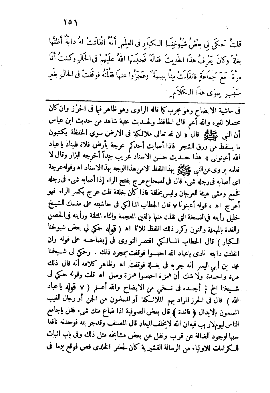 في حاشية الإيضاح وهو مجرب كما قاله الراوي وهو ظاهر فيما في الحرز وإن كان محتملًا لغيره والله أعلم قال الحافظ ولحديث عتبة شاهد من حديث ابن عباس أن النبي - صلى الله عليه وسلم - قال: "إن الله تعالى ملائكته في الأرض سوى الحفظة يكتبون ما يسقط من ورق الشجر فإذا أصابت أحدكم عرجة بأرض فلاة فليناد يا عباد الله أعينوني" هذا حديث حسن الإسناد غريب جدًّا أخرجه البزار وقال: لا نعلمه يروى عن النبي - صلى الله عليه وسلم - بهذا اللفظ إلا من هذا الوجه بهذا الإسناد اهـ. وقوله عرجة أي أصابه في رجله شيء قال في الصحاح عرج بفتح الراء إذا أصابه شيء في رجله فجمع ومشى هيئة العرجان وليس بخلقة فإذا كان خلقة قلت عرج بكسر الراء فهو أعرج اهـ، قوله: أعينونا قال الحطاب المالكي في حاشيته على منسك الشيخ خليل رأيته في النسخة التي نقلت منها بالغين المعجمة والثاء المثلثة ورأيته في الحمن والعدة بالمهملة والنون وكرر ذلك اللفظ ثلاثًا اهـ. قوله: (حكى لي بعض شيوخنا الكبار) قال الحطاب المالكي اقتصر النووي في إيضاحه على قوله وإن انفلتت دابته نادى يا عباد الله احبسوا فوقفت بمجرد ذلك. وحكى لي شيخنا محمد بن أبي اليسر أنه جربه في بغلة فوقفت اهـ. وظاهر كلامه أنه قال ذلك مرة واحدة ولا شك أن همزة احبسوا همزة وصل اهـ. قلت: وقوله حكى لي شيخنا الخ لم أجده في نسخي من الإيضاح والله أعلم. قوله: (يا عباد الله) قال في الحرز المراد بهم الملائكة أو المسلمون من الجن أو رجال الغيب المسمون بالأبدال.