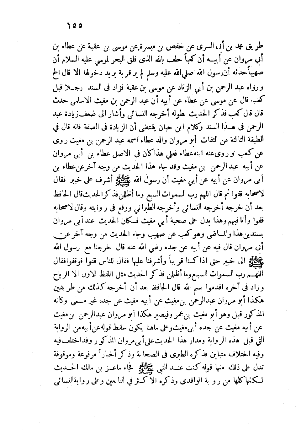 عن أبيه عبد الرحمن بن مغيث وقد جاء هذا الحديث من وجه آخر عن عطاء بن أبي مروان عن أبيه عن أبي مغيث أن رسول الله - صلى الله عليه وسلم - أشرف على خيبر فقال لأصحابه: قفوا ثم قال: اللهم رب السموات السبع وما أظللن فذكر الحديث قال الحافظ: بعد أن خرجه أخرجه النسائي وأخرجه الطبراني ووقع في روايته وقال لأصحابه: قفوا وأنا فيهم وهذا يدل على صحبة أبي مغيث فكان الحديث عند أبي مروان بسندين هذا والماضي وهو كعب عن صهيب وجاء الحديث من وجه آخر عن أبي مروان قال فيه عن أبيه عن جده رضي الله عنه قال: خرجنا مع رسول الله - صلى الله عليه وسلم - إلى خيبر حتى إذا كنا قريبًا وأشرفنا عليها فقال للناس: قفوا فوقفوا فقال: اللهم رب السموات السبع وما أظللن فذكر الحديث مثل اللفظ الأول إلا الرياح وزاد في آخره اقدموا بسم الله قال الحافظ بعد أن أخرجه كذلك من طريقين هكذا أبو مروان عبد الرحمن بن مغيث عن أبيه مغيث عن جده غير مسمى وكأنه المذكور قبل وهو أبو مغيث بن عمرو وفيصير هكذا أبو مروان عبد الرحمن بن مغيث عن أبيه مغيث عن جده أبي مغيث وعلى ما هنا يكون سقط قوله عن أبيه من الرواية التي قبل هذه الرواية ومدار هذا الحديث على أبي مروان المذكور وقد اختلف فيه وفيه اختلاف متباين فذكره الطبري في الصحابة وذكر أخبارًا مرفوعة وموقوفة تدل على ذلك منها قوله كنت عند النبي - صلى الله عليه وسلم - فجاء ماعز بن مالك الحديث لكنها كلها من رواية الواقدي وذكره أكثر في التابعين وعلى رواية النسائي