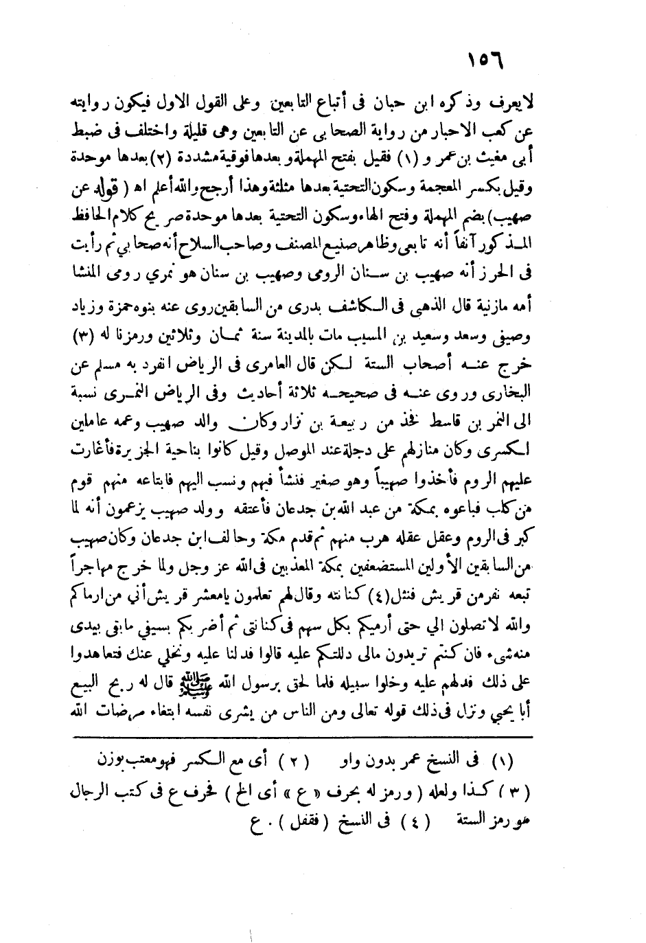 لا يعرف وذكره ابن حبان في اتباع التابعين وعلى القول الأول فتكون روايته عن كعب الأحبار من رواية الصحابي عن التابعين وهي قليلة واختلف في ضبط أبي مغيث بن عمرو فقيل بفتح المهملة وبعدها فوقية مشددة بعدها موحدة وقيل بكسر المعجمة وسكون التحتية بعدها مثلثة وهذا أرجح والله أعلم اهـ. قوله: (عن صهيب) بضم المهملة وفتح الهاء وسكون التحتية بعدها موحدة صريح كلام الحافظ المذكور آنفًا أنه تابعي وظاهر صنيع المصنف وصاحب السلاح أنه صحابي ثم رأيت في الحرز أنه صهيب بن سنان الرومي وصهيب بن سنان هو نمري رومي المنشأ أمه مازنية قال الذهبي في الكاشف بدري من السابقين روى عنه بنوه حمزة وزياد وصيفي وسعد وسعيد بن المسيب مات بالمدينة سنة ثمان وثلاثين ورمزنا له خرج عنه أصحاب الستة لكن قال العامري في الرياض انفرد به مسلم عن البخاري وروى عنه في صحيحه ثلاثة أحاديث وفي الرياض النمري نسبة إلى النمر بن قاسط فخذ من ربيعة بن نزار وكان والد صهيب وعمه عاملين لكسرى وكان منازلهم على دجلة عند الموصل وقيل: كانوا بناحية الجزيرة فأغارت عليهم الروم فأخذوا صهيبًا وهو صغير فنشأ فيهم ونسب إليهم فابتاعه منهم قوم من كلب فباعوه بمكة من عبد الله بن جدعان فأعتقه وولد صهيب يزعمون أنه لما كبر في الروم وعقل عقله هرب منهم ثم قدم مكة وحالف ابن جدعان وكان صهيب من السابقين الأولين المستضعفين بمكة المعذبين في الله عزّ وجلّ ولما خرج مهاجرًا تبعه نفر من قريش فنثل كنانته وقال لهم تعلمون يا معشر قريش أني من أرماكم والله لا تصلون إلي حتى أرميكم بكل سهم في كنانتي ثم أضربكم بسيفي ما بقي بيدي منه شيء فإن كنتم تريدون مالي دللتكم عليه قالوا: فدلنا عليه ونخلي عنك فتعاهدوا على ذلك فدلهم عليه وخلوا سبيله فلما لحق برسول الله - صلى الله عليه وسلم - قال له ربح البيع أبا يحيى ونزل في ذلك قوله تعالى: