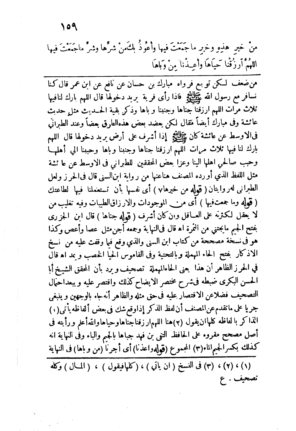من ضعف لكن توبع فرواه مبارك بن حسان عن نافع عن ابن عمر قال كنا نسافر مع رسول الله - صلى الله عليه وسلم - فإذا رأى قرية يريد دخولها قال: اللهم بارك لنا فيها ثلاث مرات اللهم ارزقنا جناها وجنبنا وباها وذكر بقية الحديث مثل حديث عائشة وفي مبارك أيضًا مقال لكن يعضد بعض هذه الطرق بعضًا وعند الطبراني في الأوسط عن عائشة كان - صلى الله عليه وسلم - إذا أشرف على أرض يريد دخولها قال: اللهم بارك لنا فيها ثلاث مرات اللهم ارزقنا جناها وجنبنا وباها وحببنا إلى أهلها وحبب صالحي أهلها إلينا وعزا بعض المحققين للطبراني في الأوسط عن عائشة مثل اللفظ الذي أورده المصنف هنا عنها من رواية ابن السني قال في الحرز ولعل الطبراني له روايتان. قوله: (من خيرها) أي نفسها بأن تستعملنا فيها لطاعتك. قوله: (وما جمعت فيها) أي من الموجودات والأرزاق الطيبات وفيه تغليب من لا يعقل لكثرته على العاقل وإن كان أشرف. قوله: (جناها) قال ابن الجزري بفتح الجيم ما يجتني من الثمرة اهـ. قال في النهاية وجمعه أجن مثل عصا وأعص وكذا هو في نسخة مصححة من كتاب ابن السني والذي وقع فيما وقفت عليه من نسخ الأذكار بفتح الحاء المهملة وبالتحتية وفي القاموس الحيا الخصب ويمد اهـ. قال في الحرز الظاهر أن هذا يعني الحاء المهملة تصحيف ويرد بأن المحقق الشيخ أبا الحسن البكري ضبطه في شرح مختصر الإيضاح كذلك واقتصر عليه ويبعد احتمال التصحيف فضلًا عن الاقتصار عليه في حق مثله والظاهر أنه جاء بالوجهين وينبغي جريًا على ما تقدم عن المصنف أن لفظ الذكر إذا وقع شك في بعض ألفاظه يأتي الذاكر بألفاظه كلها أن يقول هنا اللهم ارزقنا جناها وحياها والله أعلم ورأيته في أصل مصحح مقروء على الحافظ المتقي بن فهد جباها بالجيم والباء وفي النهاية أنه كذلك بكسر الجيم الماء المجموع. قوله: (وأعذنا) أي أجرنا (من وباها) في النهاية