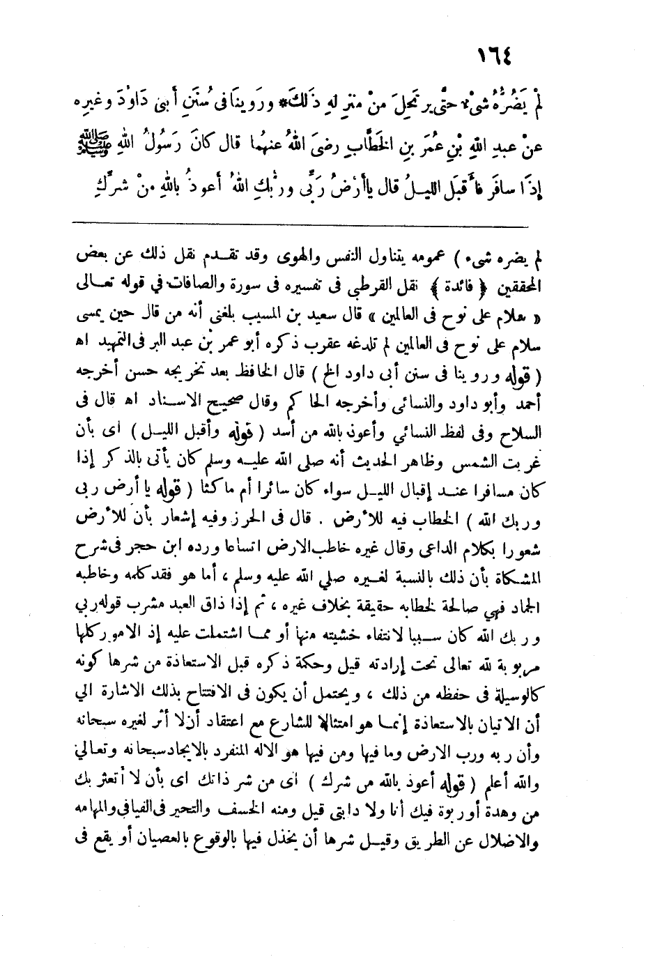 نقل القرطبي في تفسيره في سورة والصافات في قوله تعالى: {سَلَامٌ عَلَى نُوحٍ فِي الْعَالمِينَ} قال سعيد بن المسيب بلغني أنه من قال حين يمسي {سَلَامٌ عَلَى نُوحٍ فِي الْعَالمِينَ} لم تلدغه عقرب ذكره أبو عمر بن عبد البر في التمهيد اهـ. قوله: (وروينا في سنن أبي داود الخ) قال الحافظ بعد تخريجه حسن أخرجه أحمد وأبو داود والنسائي وأخرجه الحاكم وقال صحيح الإسناد أهـ. قال في السلاح وفي لفظ النسائي وأعوذ بالله من أسد. قوله: (وأقبل الليل) أي بأن غربت الشمس وظاهر الحديث أنه - صلى الله عليه وسلم - كان يأتي بالذكر إذا كان مسافرًا عند إقبال الليل سواء كان سائرًا أم ماكثا. قوله: (يا أرض ربي وربك الله) الخطاب فيه للأرض. قال في الحرز وفيه إشعار بأن للأرض شعورًا بكلام الداعي وقال غيره خاطب الأرض اتساعًا ورده ابن حجر في شرح المشكاة بأن ذلك بالنسبة لغيره - صلى الله عليه وسلم -، أما هو فقد كلمه وخاطبه الجماد فهي صالحة لخطابه حقيقة بخلاف غيره، ثم إذا ذاق العبد مشرب قوله: ربي وربك الله كان سببًا لانتفاء خشيته منها أو مما اشتملت عليه إذ الأمور كلها مربوبة الله تعالى تحت إرادته قيل وحكمة ذكره قبل الاستعاذة من شرها كونه كالوسيلة في حفظه من ذلك، ويحتمل أن يكون في الافتتاح بذلك الإشارة إلى أن الإتيان بالاستعاذة إنما هو امتثالًا للشارع مع اعتقاد أن لا أثر لغيره سبحانه وأن ربه ورب الأرض وما فيها ومن فيها هو الإله المنفرد بالإيجاد سبحانه وتعالى والله أعلم. قوله: (أعوذ بالله من شرك) أي من شر ذاتك أي بأن لا أتعثر بك من وهدة أو ربوة فيك أنا ولا دابتي