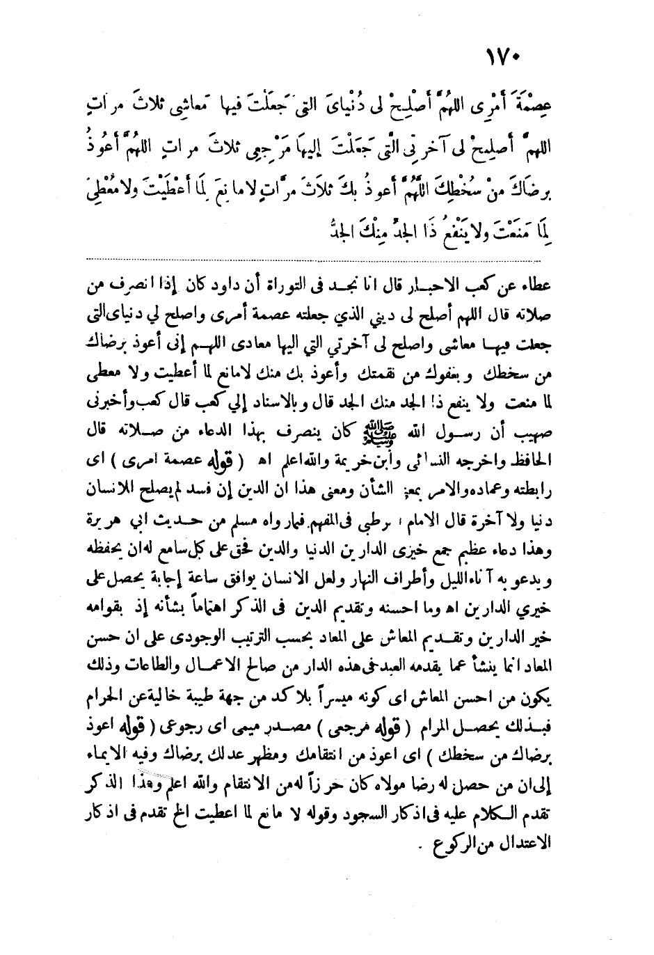 عطاء عن كعب الأحبار قال: إنا نجد في التوراة أن داود كان إذا انصرف من صلاته قال: اللهم أصلح لي ديني الذي جعلته عصمة أمري واصلح لي دنياي التي جعلت فيها معاشي وأصلح لي اخرتي التي إليها معادي اللهم إني أعوذ برضاك من سخطك وبعفوك من نقمتك وأعوذ بك منك لا مانع لما أعطيت ولا معطي لما منعت ولا ينفع ذا الجد منك الجد قال وبالإسناد إلى كعب قال كعب وأخبرني صهيب أن رسول الله - صلى الله عليه وسلم - كان ينصرف بهذا الدعاء من صلاته قال الحافظ وأخرجه النسائي وابن خزيمة والله أعلم اهـ. قوله: (عصمة أمري) أي رابطته وعماده والأمر بمعنى الشأن ومعنى هذا أن الدين إن فسد لم يصلح للإنسان دنيا ولا آخرة قال الإِمام القرطبي في المفهم فما رواه مسلم من حديث أبي هريرة وهذا دعاء عظيم جمع خيري الدارين الدنيا والدين فحق على كل سامع له أن يحفظه ويدعو به آناء الليل وأطراف النهار ولعل الإنسان يوافق ساعة إجابة يحصل على خيري الدارين اهـ، وما أحسنه وتقديم الدين في الذكر اهتمامًا بشأنه إذ بقوامه خير الدارين وتقديم المعاش على المعاد بحسب الترتيب الوجودي على أن حسن المعاد إنما ينشأ عما يقدمه العبد في هذه الدار من صالح الأعمال والطاعات وذلك يكون من أحسن المعاش أي كونه ميسرًا بلا كد من جهة طيبة خالية عن الحرام فبذلك يحصل المرام. قوله: (مرجعي) مصدر ميمي أي رجوعي. قوله: (أعوذ برضاك من سخطك) أي أعوذ من انتقامك ومظهر عدلك برضاك وفيه الإيماء إلى أن من حصل له رضا مولاه كان حرزًا له من الانتقام والله أعلم وهذا الذكر تقدم الكلام عليه في أذكار السجود وقوله: لا مانع لما أعطيت الخ تقدم في أذكار الاعتدال من الركوع.