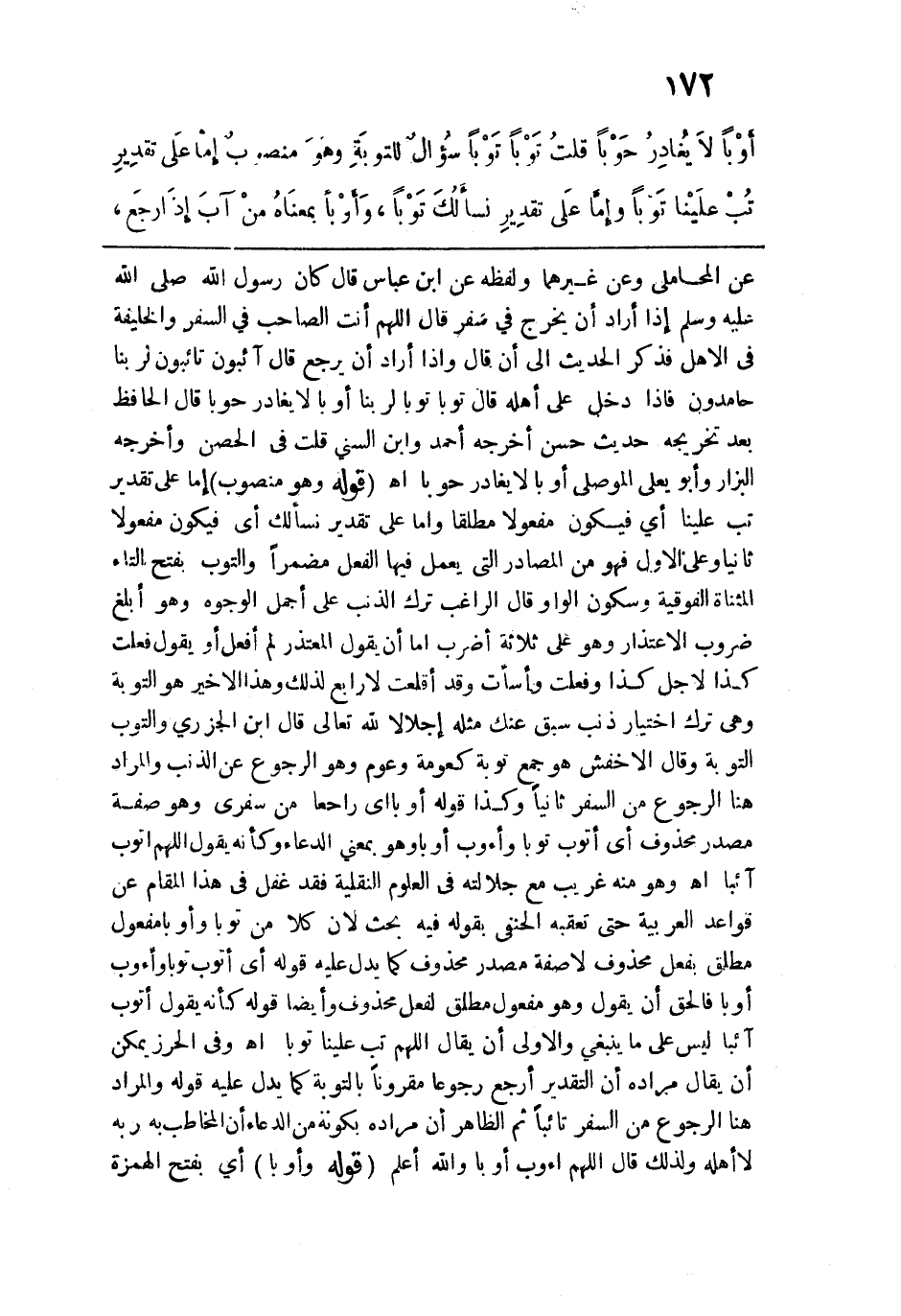عن المحاملي وعن غيرهما ولفظه عن ابن عباس قال: كان رسول الله - صلى الله عليه وسلم - إذا أراد أن يخرج في سفر قال: اللهم أنت الصاحب في السفر والخليفة في الأهل فذكر الحديث إلى أن قال وإذا أراد أن يرجع قال: آئبون تائبون لربنا حامدون فإذا دخل على أهله قال: توبا توبا لربنا أوبا لا يغادر حوبا قال الحافظ بعد تخريجه حديث حسن أخرجه أحمد وابن السني قلت في الحصن وأخرجه البزار وأبو يعلى الموصلي أوبا لا يغادر حوبا اهـ. قوله: (وهو منصوب) إما على تقدير تب علينا أي فيكون مفعولًا مطلقًا وإما على تقدير نسألك أي فيكون مفعولًا ثانيًا وعلى الأول فهو من المصادر التي يعمل فيها الفعل مضمرًا والتوب بفتح التاء المثناة الفوقية وسكون الواو قال الراغب ترك الذنب على أجمل الوجوه وهو أبلغ ضروب الاعتذار وهو على ثلاثة أضرب إما أن يقول المعتذر لم أفعل أو يقول فعلت كذا لأجل كذا وفعلت وأسأت وقد أقلعت لا رابع لذلك وهذا الأخير هو التوبة وهي ترك اختيار ذنب سبق عنك مثله إجلالًا الله تعالى قال ابن الجزري والتوب التربة وقال الأخفش هو جمع توبة كعومة وعوم وهو الرجوع عن الذنب والمراد هنا الرجوع من السفر ثانيًا وكذا قوله أوبًا أي راجعًا من سفري وهو صفة مصدر محذوف أي أتوب توبًا وأؤوب أوبأ وهو بمعنى الدعاء وكأنه يقول اللهم أتوب آئبًا اهـ. وهو منه غريب مع جلالته في العلوم النقلية فقد غفل في هذا المقام عن قواعد العربية حتى تعقبه الحنفي بقوله فيه بحث لأن كلًّا من توبًا وأوبًا مفعول مطلق بفعل محذوف لا صفة مصدر محذوف كما يدل عليه قوله أي أتوب توبًا وأؤوب أوبًا